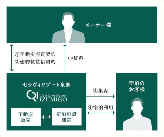 別荘地の開発分譲をはじめて50年の歴史を誇るセラヴィリゾート泉郷が提案する「ReVOS」は、ご所有の別荘を使わない期間に宿泊棟(客室)としてご提供いただき、代わりにオーナー様が賃料を得たり、様々な所有負担の軽減を可能とする合理的なシステムです。