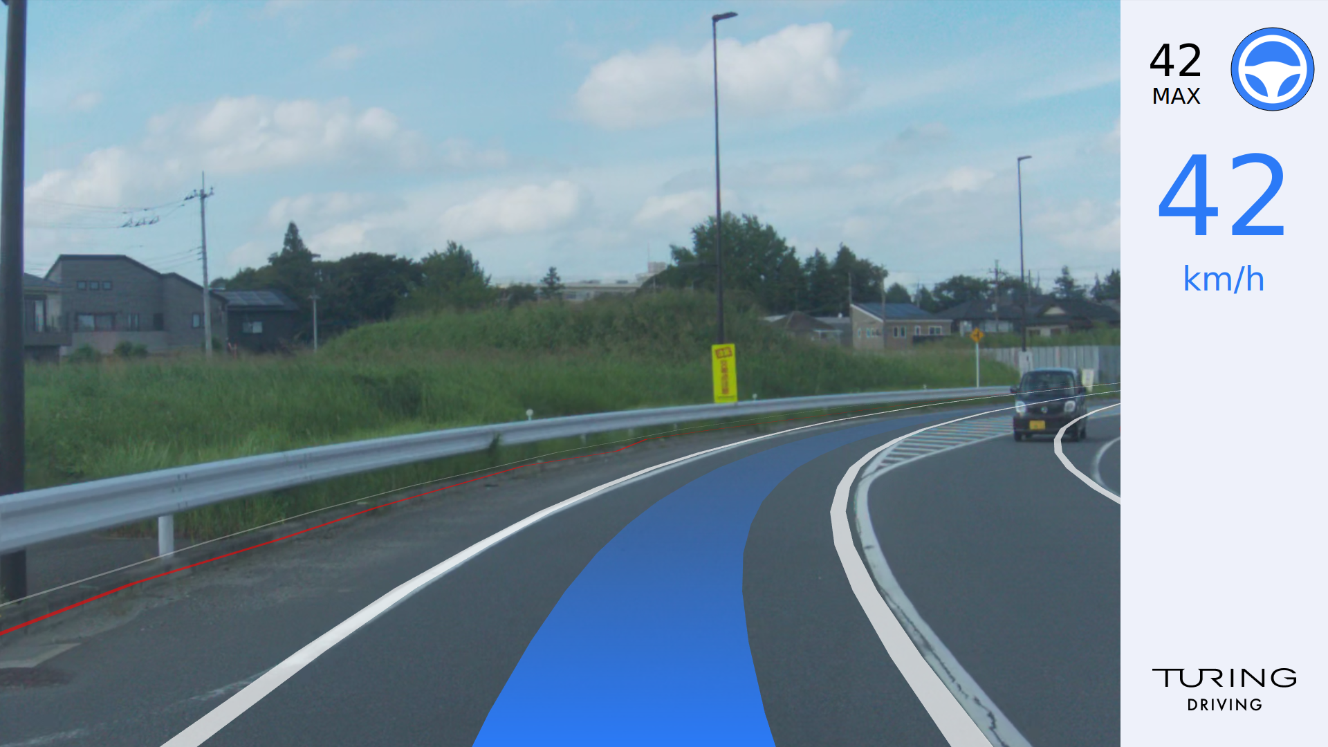 従来の自動運転/運転支援技術は、多種多様なセンサーや周辺領域の高精度3次元データなどを用いて動きを制御するというアプローチをとることがほとんどでした。一方、チューリングのAI自動運転機能は「人間が目で見たものを頭で判断して運転する」のと同様に、特殊なセンサー等を用いず、フロントガラスに取り付けられたカメラで読み込んだ画像データから、白線や前走車をAIが検知/判断し車両を操作します。チューリングはこの技術を、昨年10月に実施された「北海道一周長距離走行実証」を含む、各地での実証で進化させてきました。