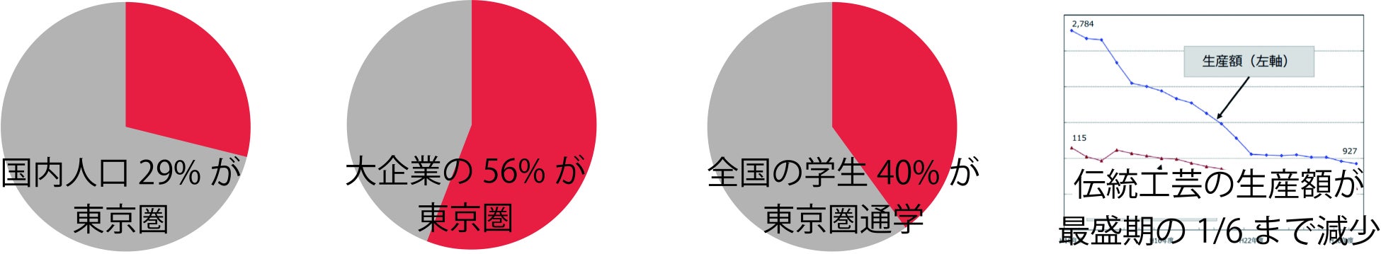 日本では大学生の約40%は首都圏通学を占め、更に総人口の1/4 は東京圏に在住するほど、東京一極集中が進んでいます。多くの若年層はそのまま首都圏の企業に就職し、地元と接点をもてずに働き続けています。また郷土愛はあっても経営知識や経験もない学生が、いきなり地元企業で活躍することも難しく「将来地元に関わりたいけれど、何ができるか分からない」「そもそも地元の企業を知らない」など、若い世代の多くは地元と関わる術や接点がないのが現状です。一方、日本各地に残る伝統工芸の出荷額は、最盛期の1/6 にまで減少し、多くの工芸メーカーや地域産品事業者は、人材不足に悩む状態です。
