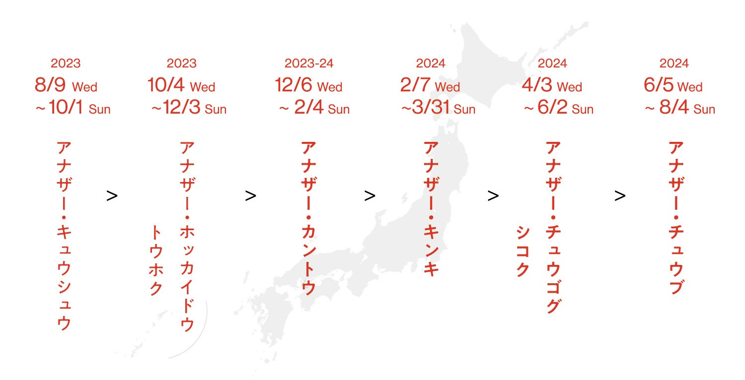 アナザー・ジャパンは、2ヶ月ごとに特集地域が入れ替わる地域産品セレクトショップです。第2期生は九州からスタートし、北海道東北、関東、近畿、中国四国、中部エリアへと続きます。