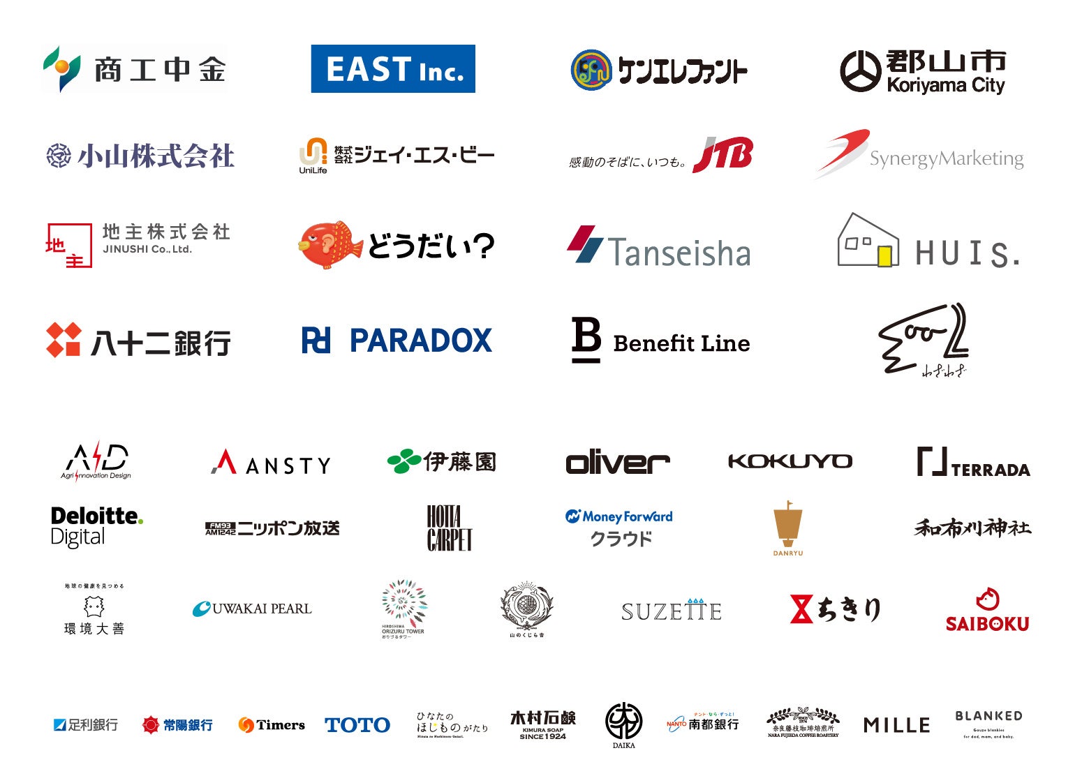 株式会社商工組合中央金庫/株式会社イースト/株式会社ケンエレファント/郡山市/小山株式会社/株式会社ジェイ・エス・ビー/株式会社JTB/シナジーマーケティング株式会社/地主株式会社/大同生命株式会社/株式会社丹青社/株式会社HUIS/株式会社八十二銀行/株式会社パラドックス/株式会社ベネフィットライン/株式会社わざわざ/株式会社アグリイノベーションデザイン/株式会社アスティ/株式会社伊藤園/株式会社オリバー/コクヨ株式会社/寺田倉庫株式会社/デロイトデジタル/株式会社ニッポン放送/株式会社ファミリア/堀田カーペット株式会社/株式会社マネーフォワード/有限会社神村酒造/和布刈神社/環境大善株式会社/宇和海真珠株式会社/株式会社広島マツダ/株式会社山のくじら舎/株式会社シュゼット・ホールディングス/ちきり清水商店株式会社/株式会社サイボク/株式会社足利銀行/株式会社常陽銀行/株式会社Timers/TOTO株式会社/合同会社フードマーク/木村石鹼工業株式会社/大化産業株式会社/株式会社南都銀行/フジエダ珈琲株式会社/株式会社MILLE/有限会社ナカモリ |
