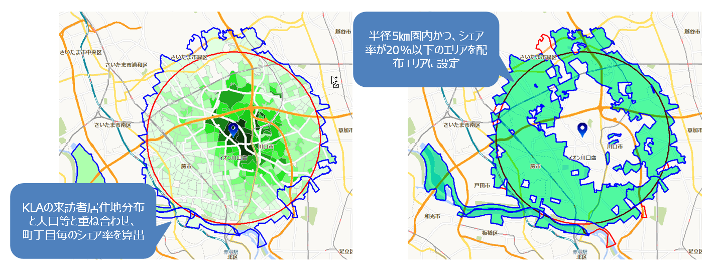 ・KLAを用いて企業様のリアル店舗の商圏内の最適販促エリアを分析し、ご提示します。