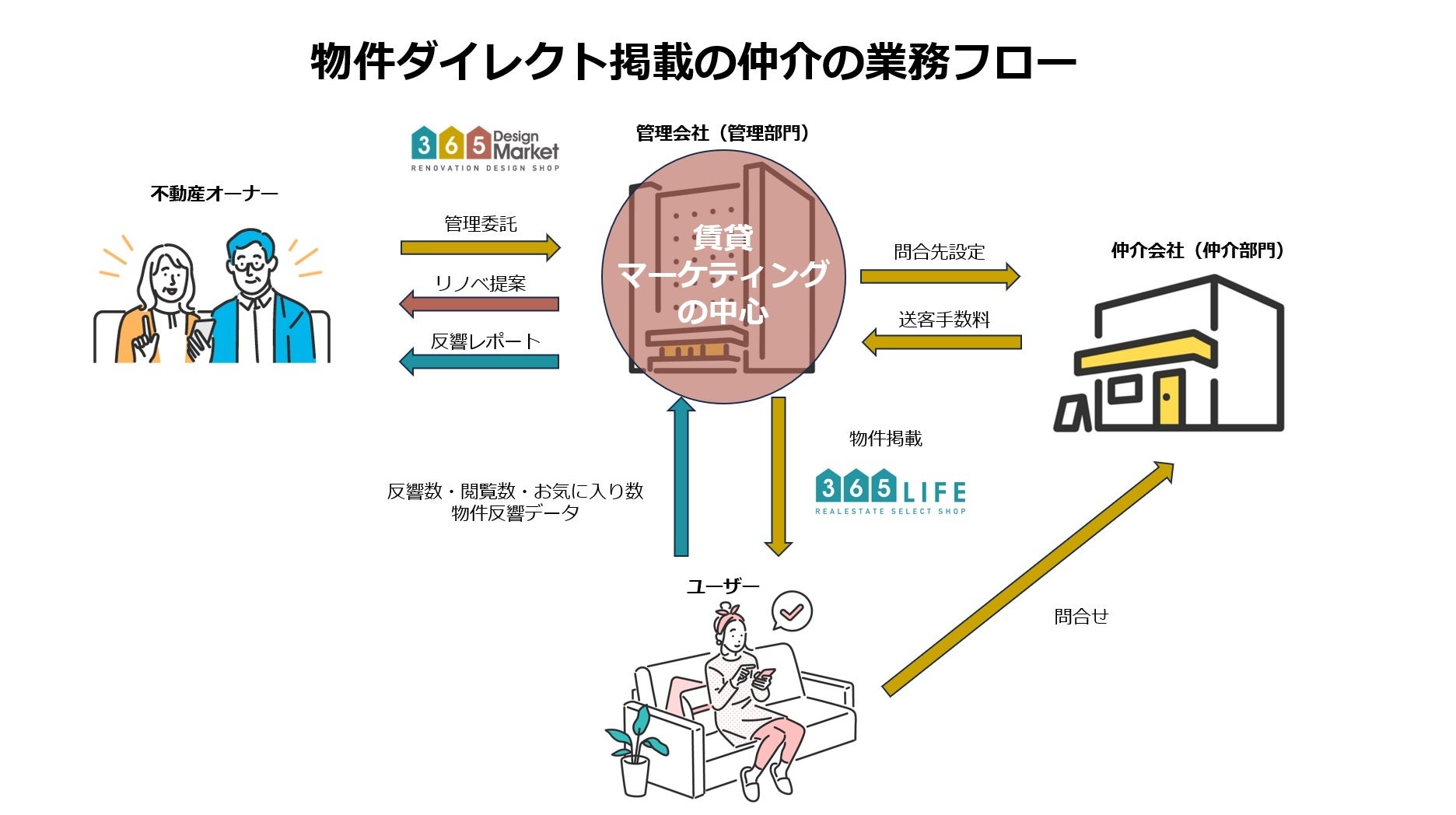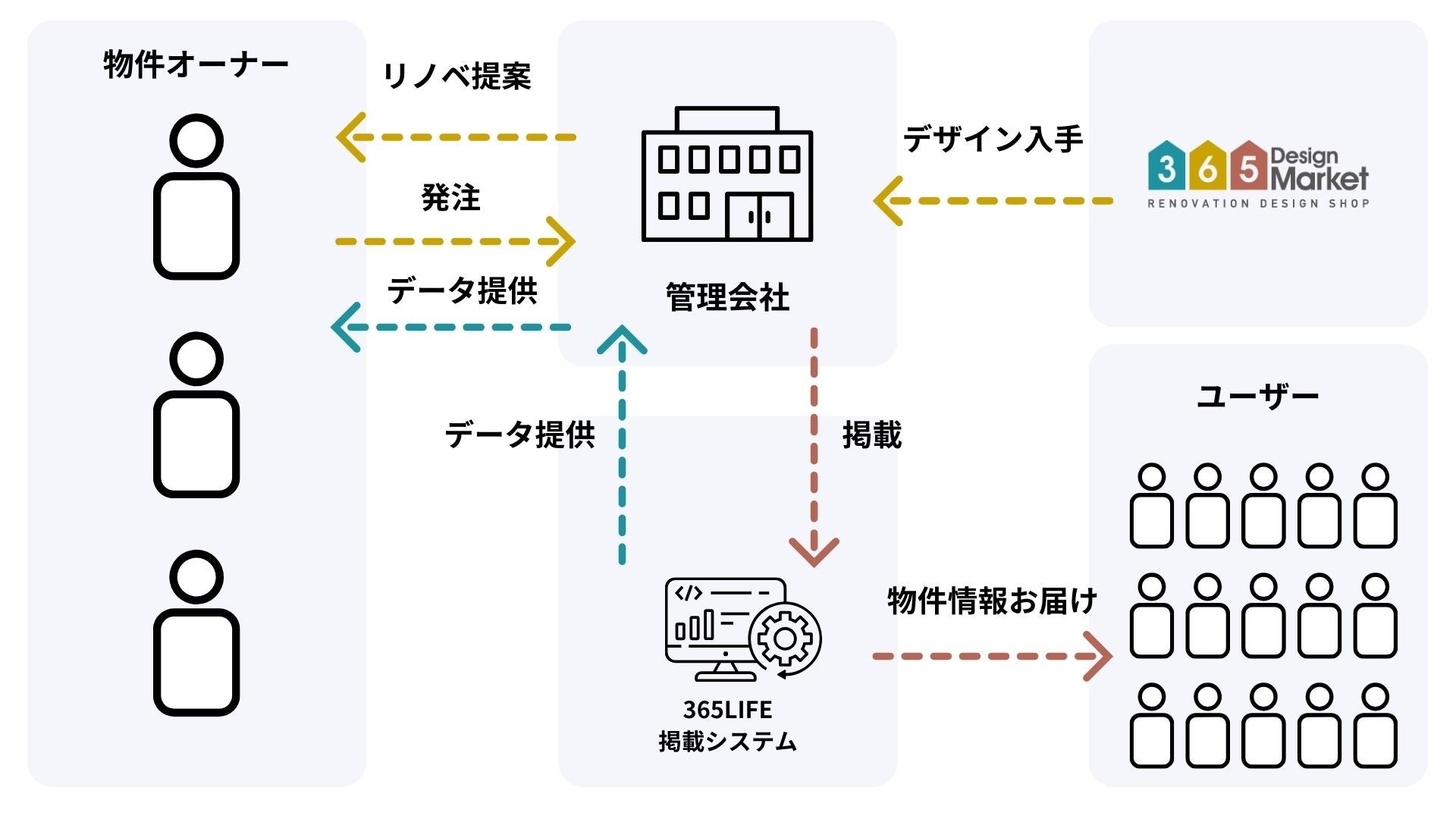 365Design Marketでリノベーションの提案を行い賃料UPの期待に応え、365LIFEでの掲載で早期客付けと次の提案に繋げるためのデータを獲得します。