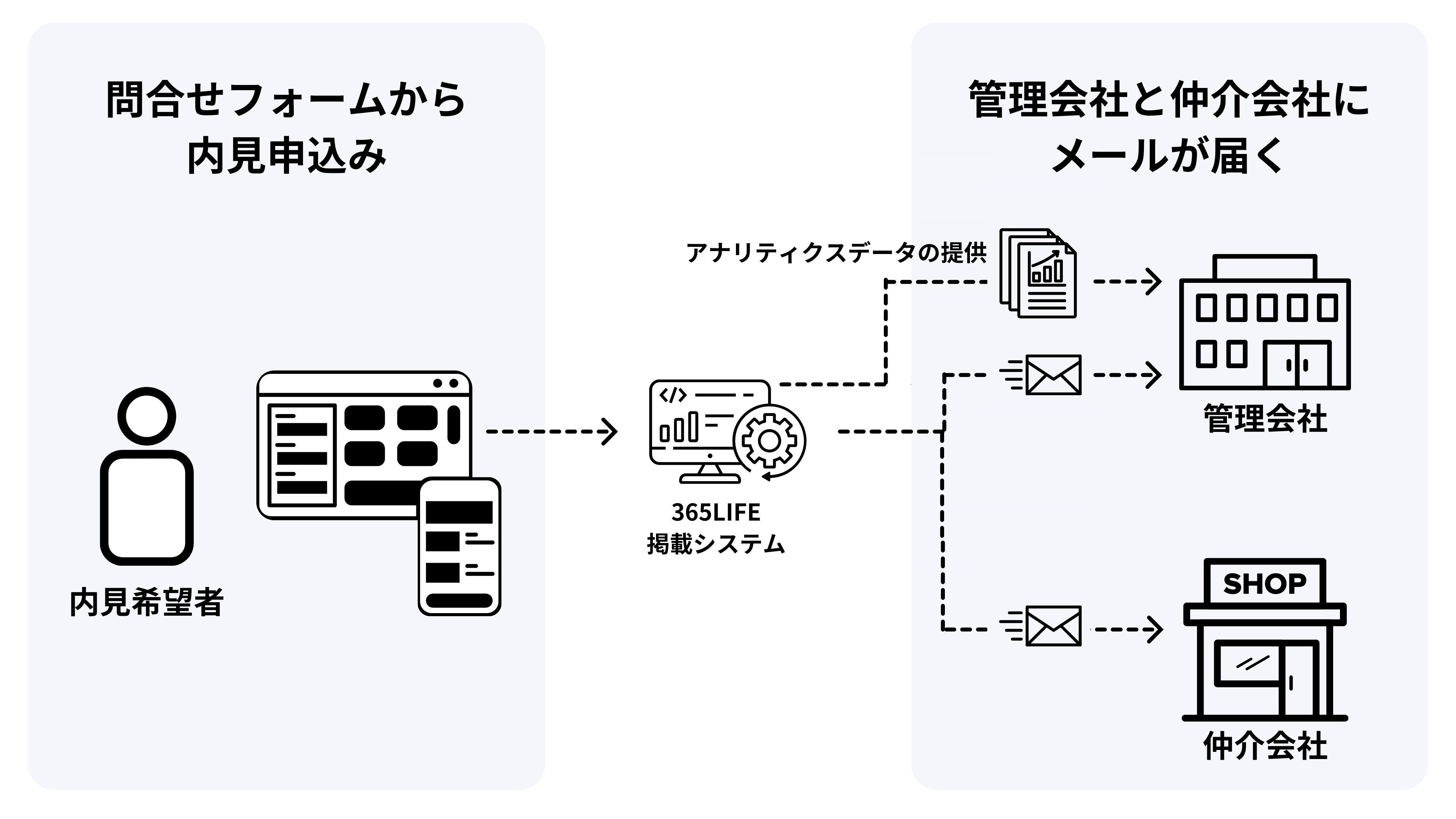管理会社にも問合せメールが転送されることで反響内容を把握でき、そのデータをリノベーションなど空室対策に反映できる。また不動産オーナーにも仔細な反響状況をレポートすることで信頼獲得にも繋がる。