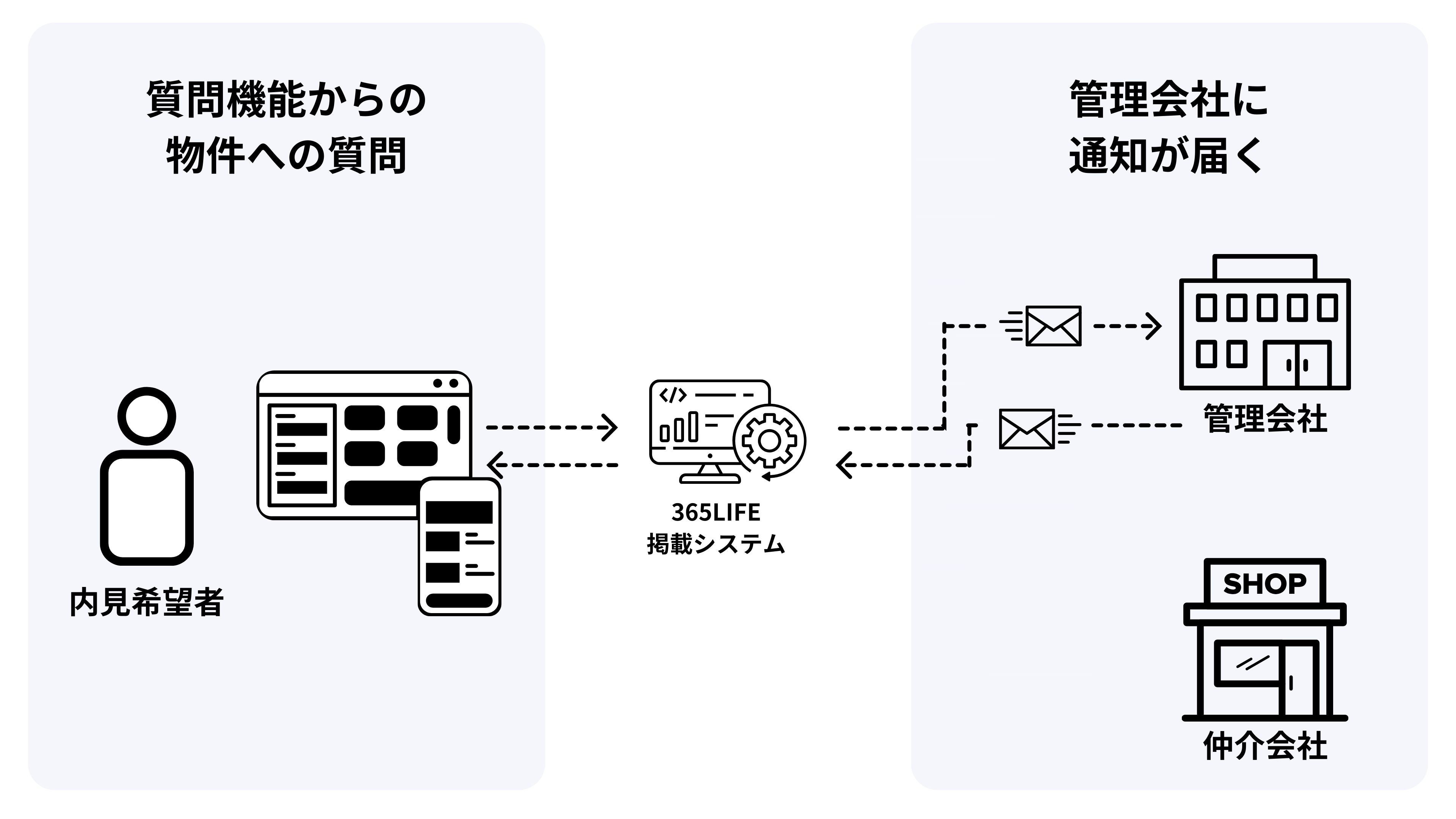 365LIFEには物件の検討段階のユーザーが匿名で質問ができる機能があり、掲載元の管理会社に直接通知されます。そこで潜在的なユーザーへのアプローチをすること、ユーザー視点での物件へのフィードバックを受けることができます。そしてこのフィードバックを元に、不動産オーナーに改善策を提案することができます。