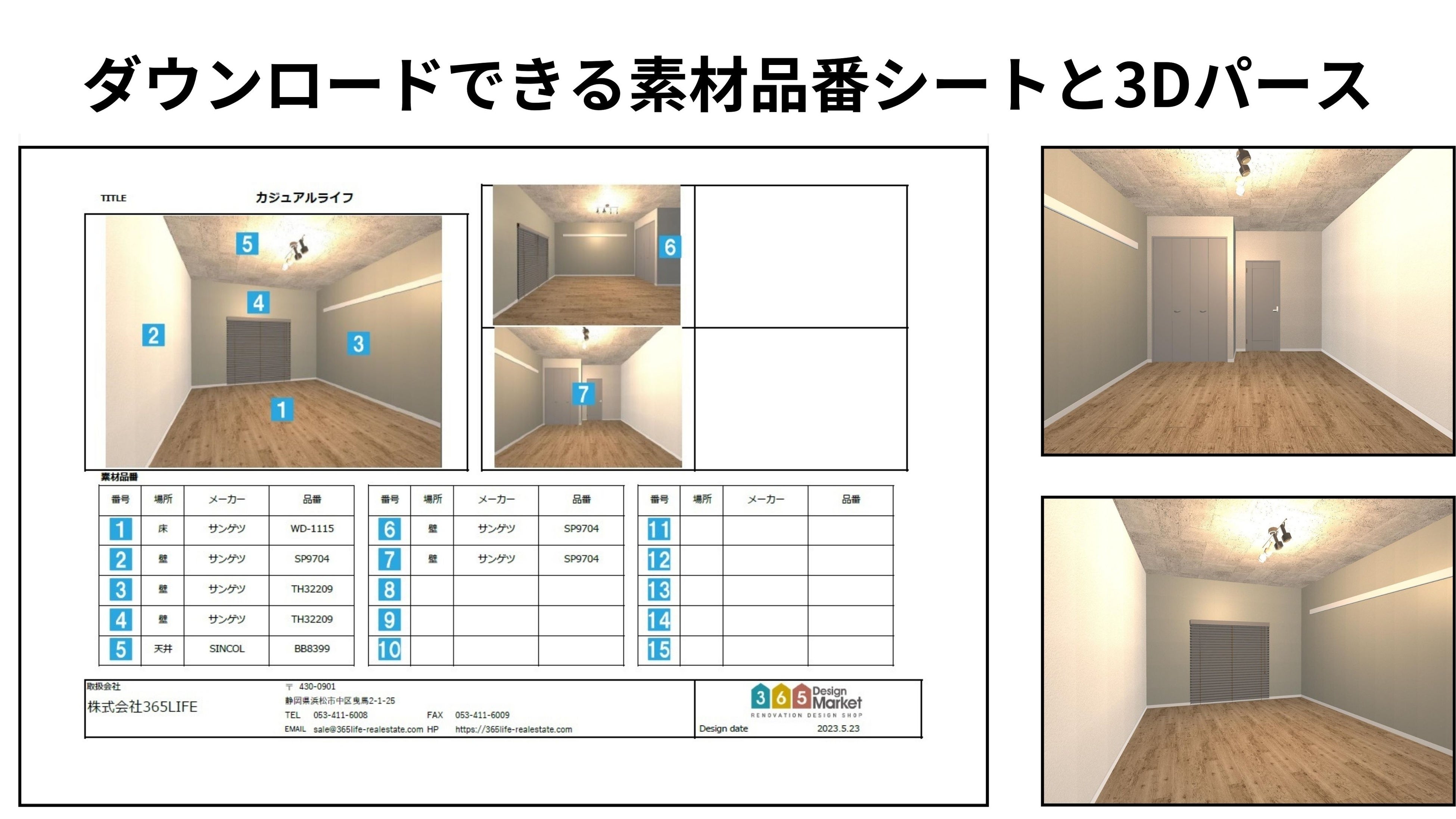 365Design Marketは管理会社のリノベーションの営業促進に繋げられるよう、デザイン提供をしているサービスです。リノベーションの提案に必要な3Dパースと、それに紐づく床・壁紙の品番シート、不動産オーナーへのリノベーション提案用シートの3点"リノベのレシピ"をダウンロードしてご利用いただけます。