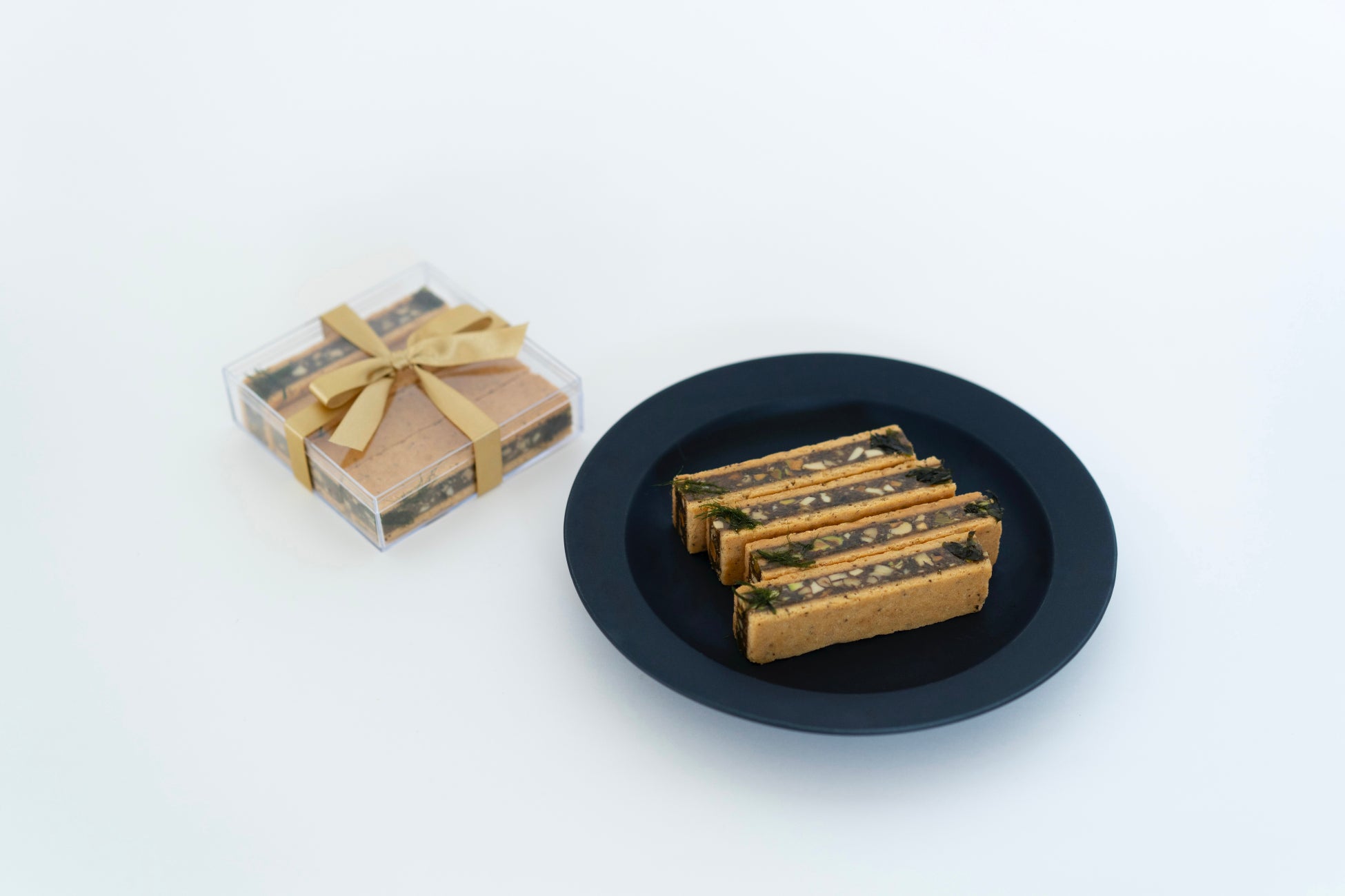 <すじ青のり>の力強い磯の香りと<はばのり>の心地よい苦味と青っぽさによるハーバルな香りが絶妙に交わり、また、プランフォリアバニラの香りが重なることで、ほろ苦く香ばしく、そしてフレッシュさも感じさせる唯一無二のアロマスイーツが完成しました。