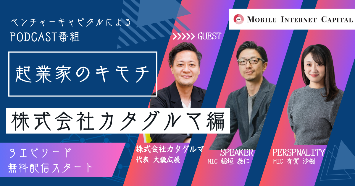 モバイル・インターネットキャピタル株式会社(代表取締役:元木新、本社:東京都千代田区、以下MIC)は、弊社が運営するPodcast番組「起業家のキモチ」において、保育・教育関連業界の人材育成プラットフォーム「KatagrMa(カタグルマ)」を提供する株式会社カタグルマ(本社:東京都千代田区、代表取締役:大嶽 広展、以下カタグルマ)の代表大嶽氏をゲストに迎え、新エピソードの配信をスタートしました。当番組はSpotify、Apple Podcasts、Amazon Music等の各プラットフォームを通じて、いつでも無料でお聞きいただけます。