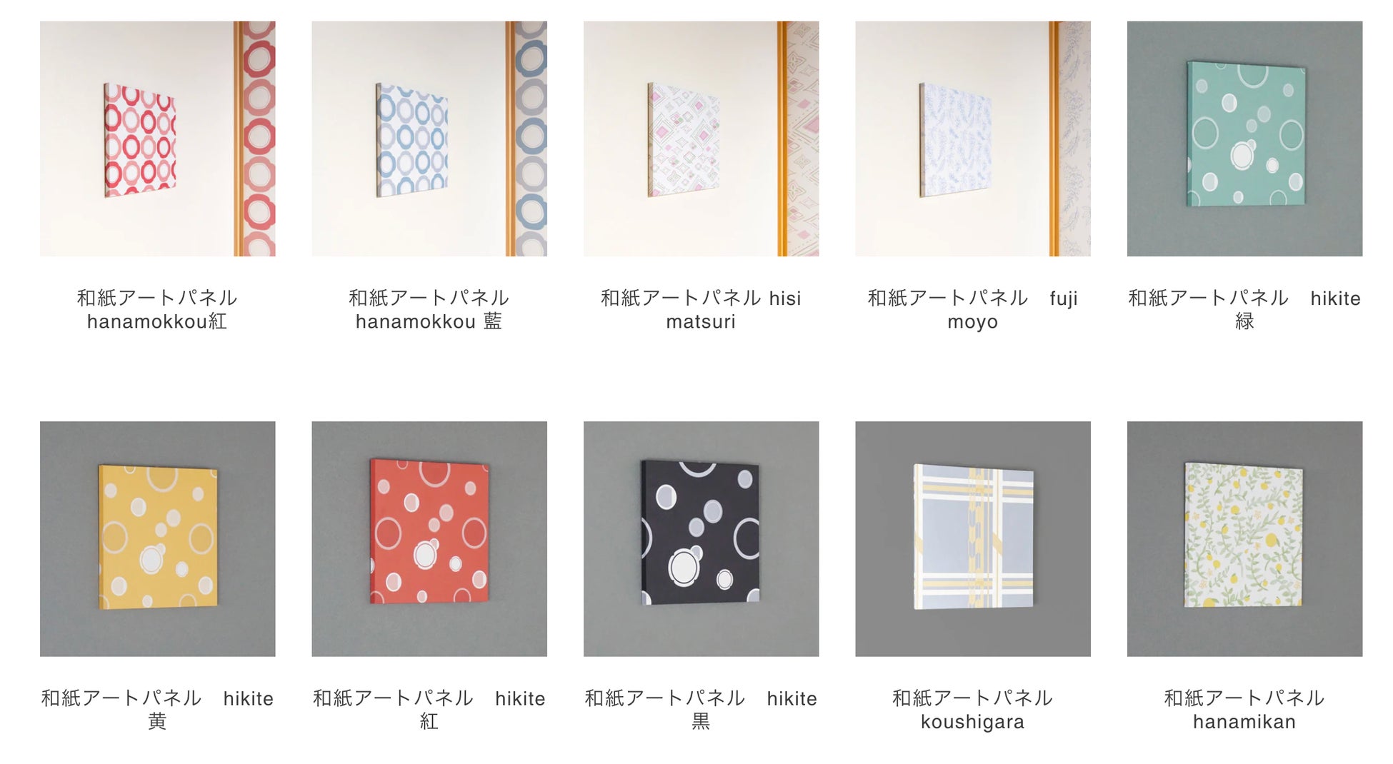 アートパネルとは、壁紙や和紙などの素材を、木製や発泡スチロールの土台に張り込んで作ったアートです。今回の和紙アートパネルは、waccaraのコンセプトであるふすま柄を使用して作っています。7種類販売していますのでぜひご利用いただければと思います。