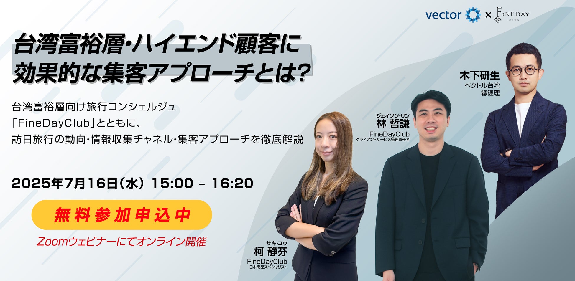 株式会社ベクトル(本社:東京都港区、代表取締役会長兼社長CEO:西江 肇司、東証プライム:6058、以下ベクトル)の台湾法人であるVector Group International Limited(Taiwan)(所在地:台北市、総経理 木下 研生、以下ベクトル台湾)は、台湾富裕層向けの旅行コンシェルジュサービスを手掛ける酷遊天國際旅行社股份有限公司(以下FineDayClub)と共同で、2025年7月16日(水)にオンラインセミナーを開催いたします。本セミナーでは、台湾人富裕層の訪日旅行動向や情報収集のチャネル、さらに効果的な集客アプローチについて解説いたします。