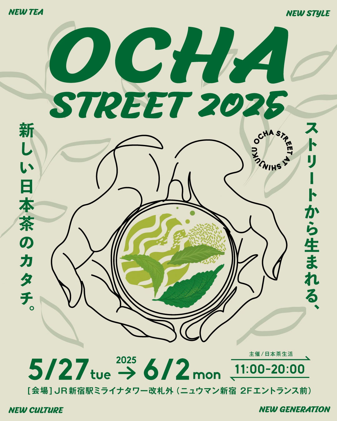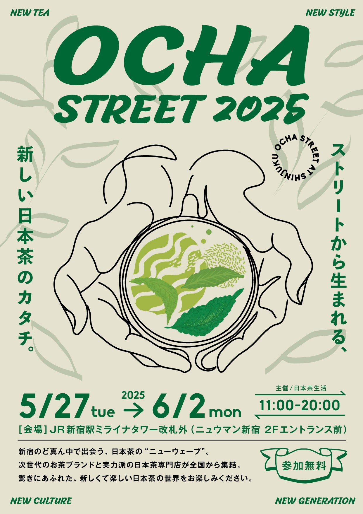 日本茶のイベント企画やメディア運営を行う日本茶生活合同会社(東京都中央区)は、2025年5月27日(火)から6月2日(月)までの7日間、JR新宿駅ミライナタワー改札外(ニュウマン新宿 2Fエントランス前)にて、日本茶マルシェ「OCHA STREET(お茶ストリート) 2025」を開催します。