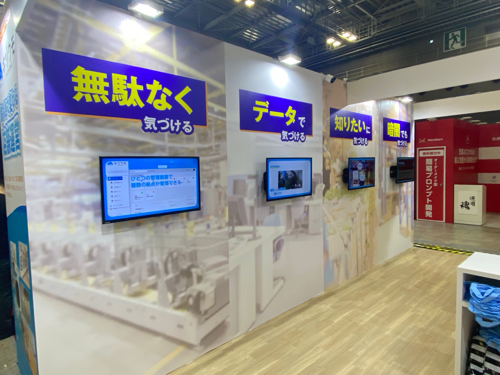 さらに、展示ブース内では、“暗闇でも気づける” “知りたいに気づける” “データで気づける” “無駄なく気づける” 4つのテーマで、キヅクモの暗視機能、検知・通知機能、マーケティング機能、権限設定について動画を放映いたしました。