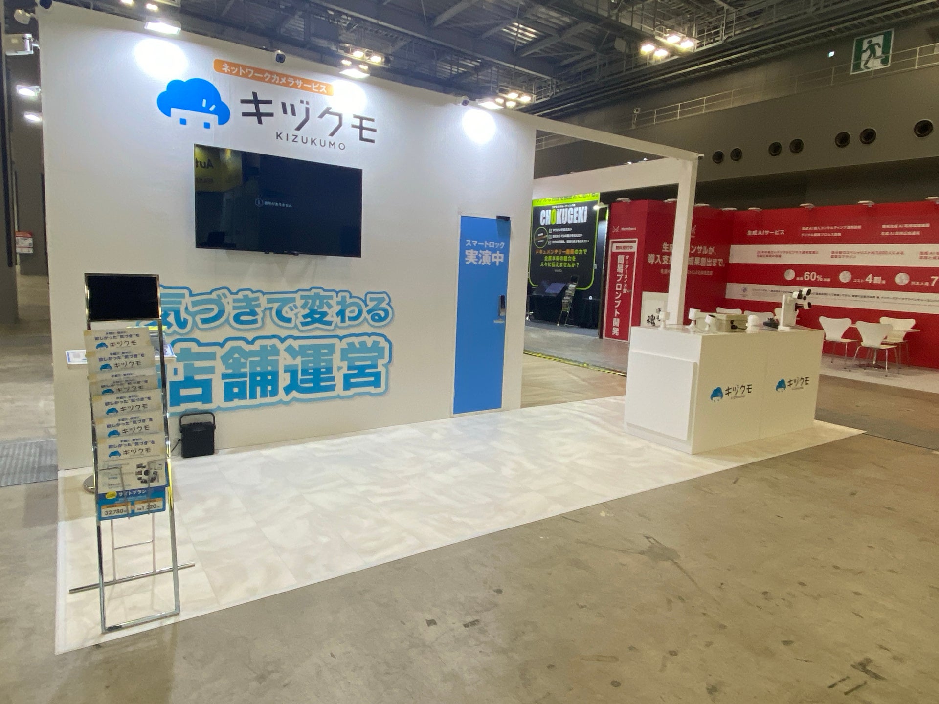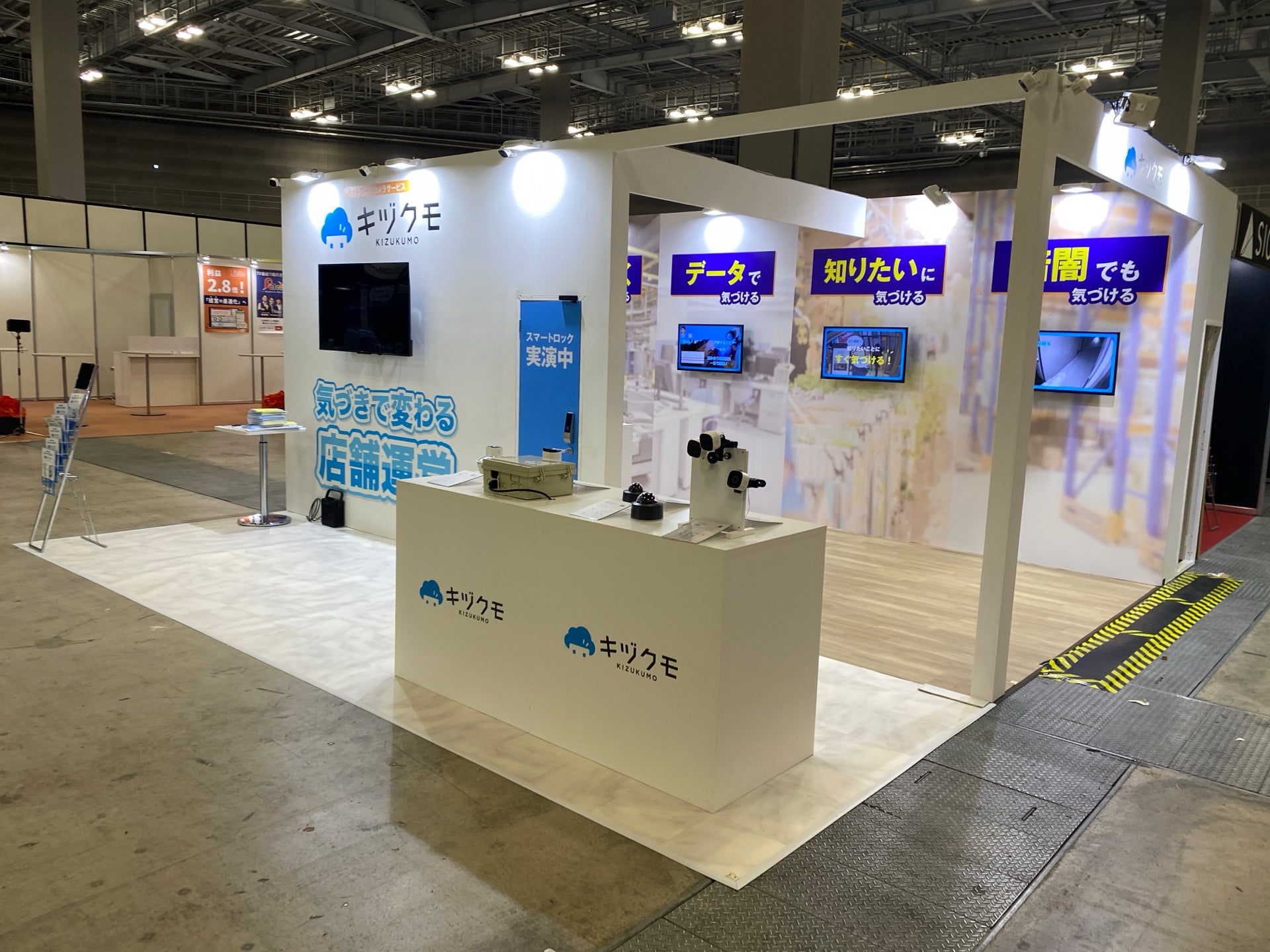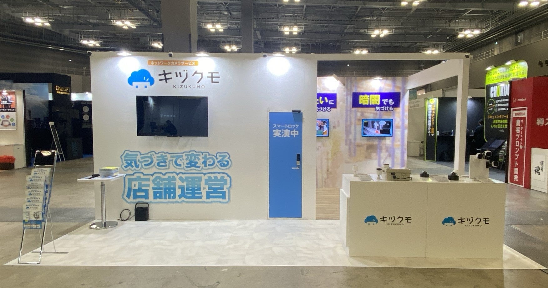 今回の展示会では、”気づくで変わる店舗運営”というテーマで、ブースではAI分析機能を持つネットワークカメラサービスやカメラと連動できるスマートロックの展示を行いました。展示コーナーには屋内、屋外、Wi-Fi、有線タイプなど全種類のカメラを展示し、来場者の方々に形状やサイズなど実機を見ていただける機会となりました。また、ブース内ではキヅクモカメラ10台を設置し、実際に設置したカメラと撮影内容を見ていただくこともでき、より製品に対して理解を深め、ウェブサイトや資料などでは伝わりきらない製品の魅力を感じていただくことができました。