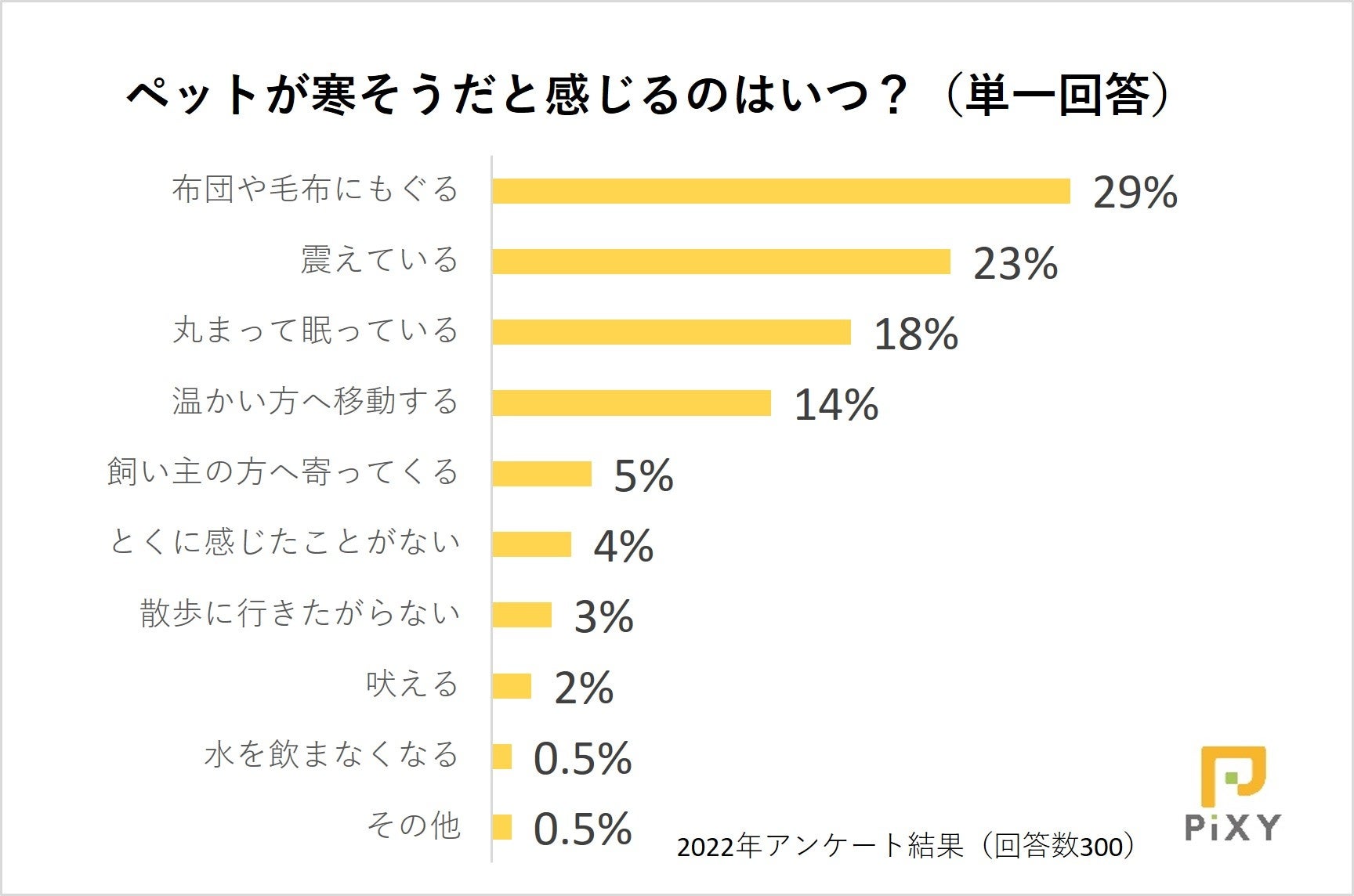 ペット領域のウェブマーケティングを専門とする株式会社ピクシー(東京都渋谷区代々木、代表取締役:小倉 鉄平、URL:https://pi-xy.co.jp/)は、定期的にペットに関する情報を調査してマーケティングの把握などに役立てており、ペットと飼い主さまの暮らしを向上させるため調査内容の一部を公開しています。今回はペットの寒さ対策について、飼い主さま300人を対象に実施したアンケート調査の結果を発表します。