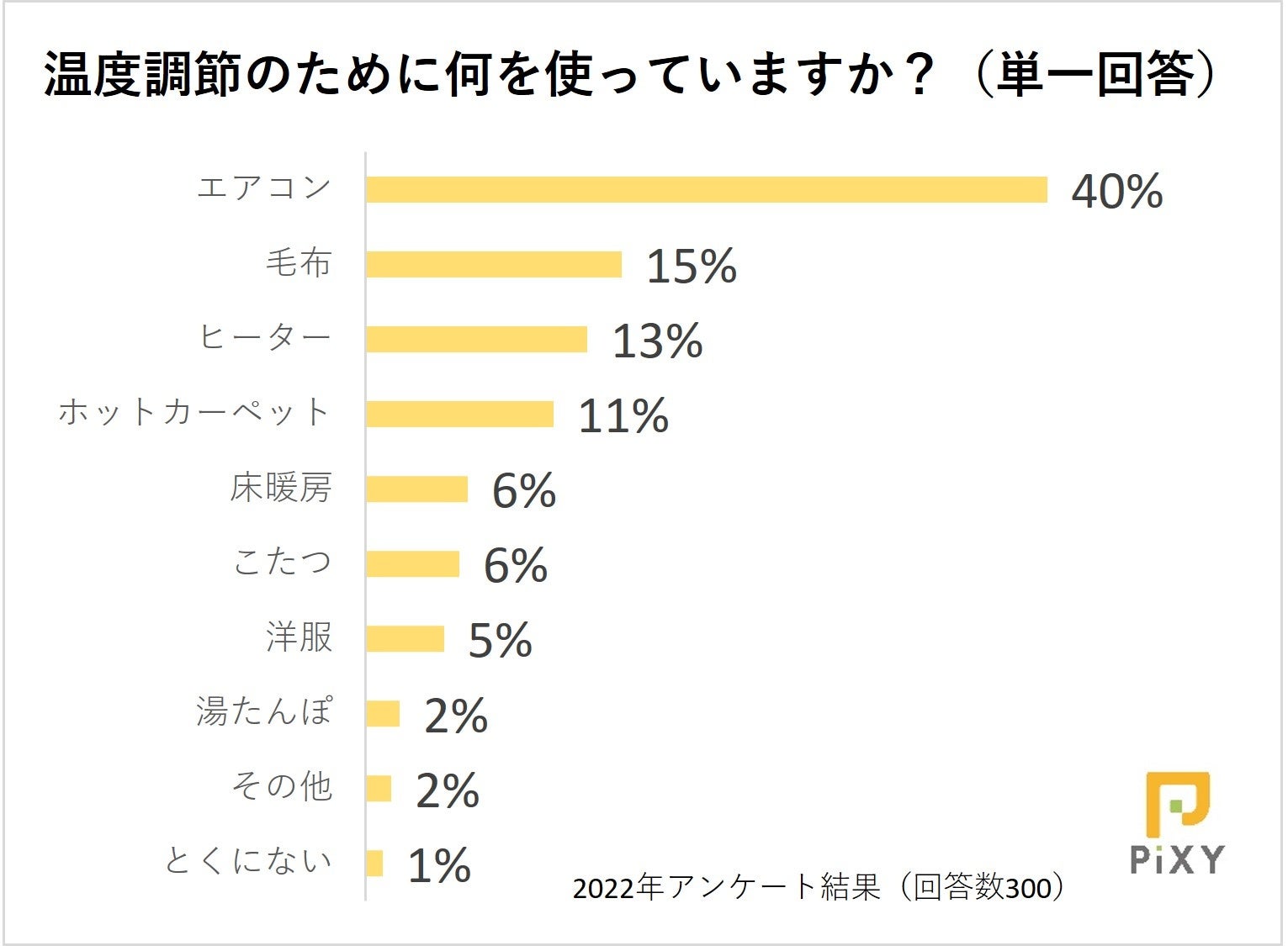 室温の調節に何を使っているかと聞いたところ、「エアコン(40%)」という回答がほかに差をつけて1位となりました。エアコンを設置している家は多いため、簡単に温度調節ができるエアコンが最初の選択肢になるのではないでしょうか。