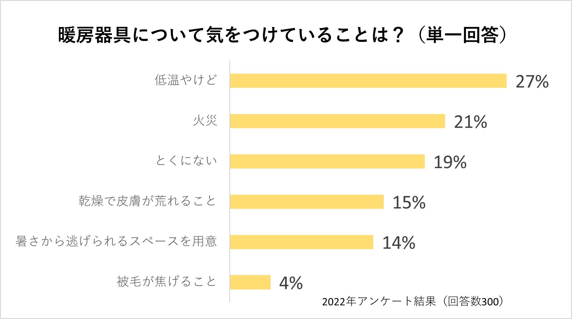 暖房器具について気をつけていることは何かという質問では、1位が「低温やけど(27%)」で2位は「火災(21%)」でした。