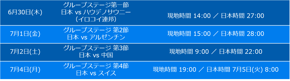 今大会には、過去最多となる30の国と地域が参加します。予選は5チームずつ、A~Fの6グループに分かれ、各グループの上位2チームが決勝トーナメントに進出します。予選グループEの日本は、ハウデノサウニー(イロコイ連邦)、アルゼンチン、中国、スイスと戦います。