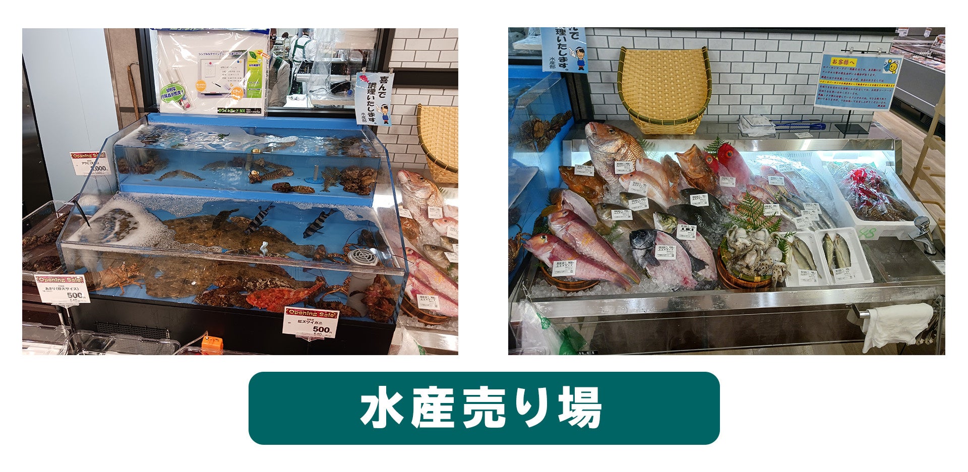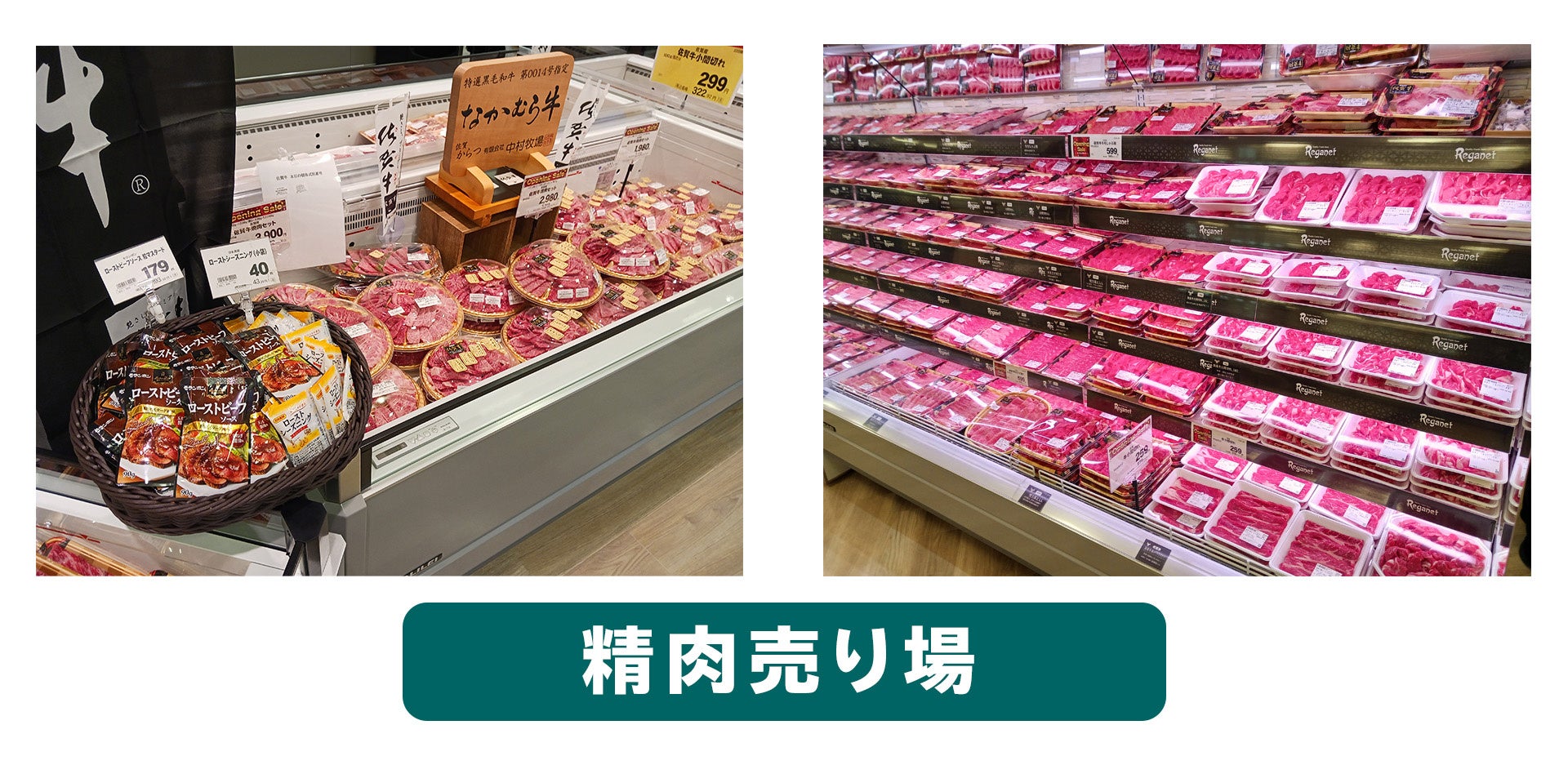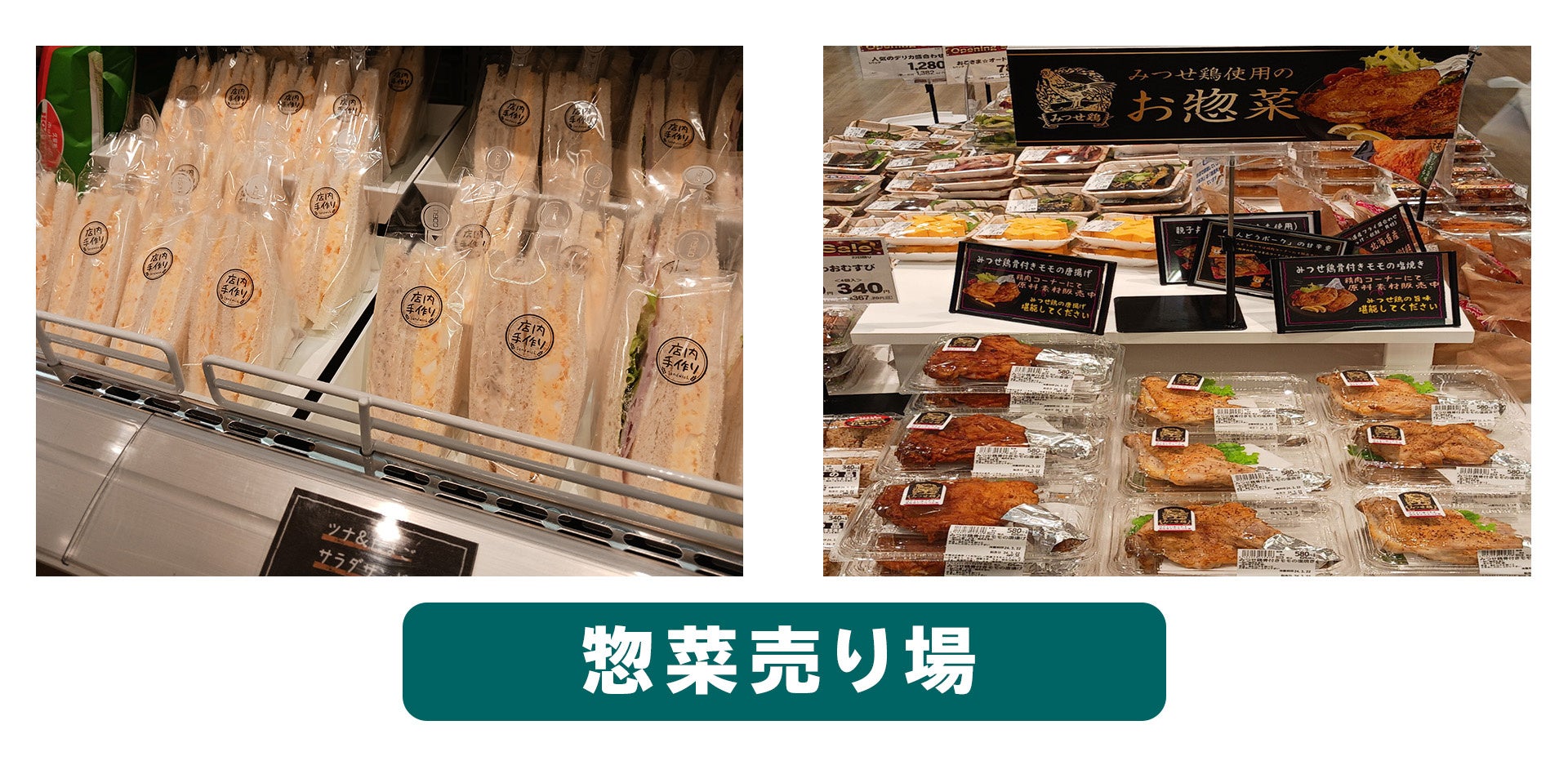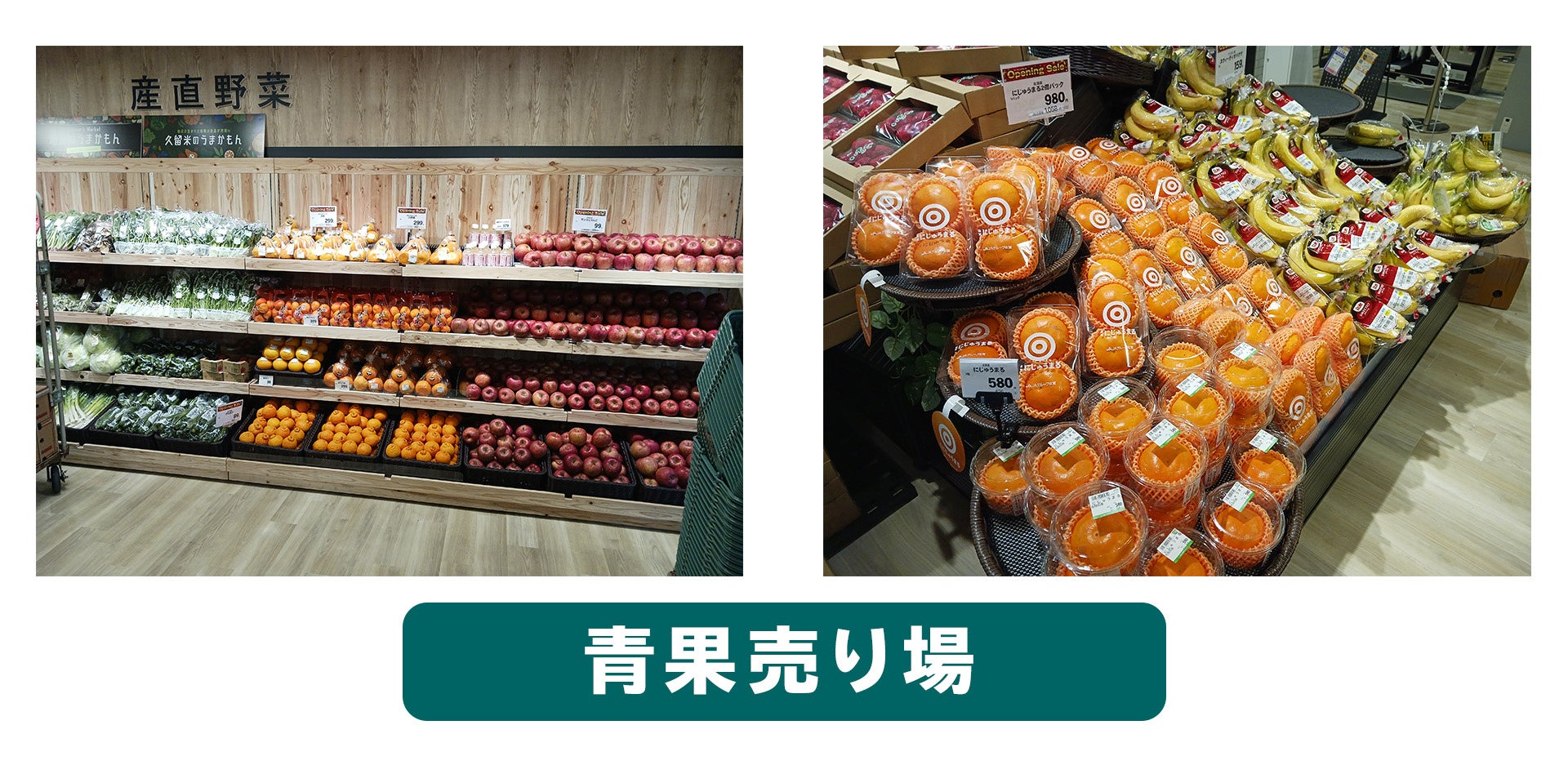 産直売場には「Farmer`s Marketコーナー」「久留米のうまかもんコーナー」を新設し、九州の各地より厳選した産直野菜と久留米の地元の野菜をご提供、青果売場には店内で販売している新鮮なフルーツを使い「カットフルーツ」も充実してます。精肉売場には、「佐賀牛コーナー」「鹿児島黒豚の黒の匠コーナー」「みつせ鶏コーナー」を設置し、特に佐賀牛コーナーにおいては産地を特定し「中村牧場」からの高級和牛を展開。また総菜売場では、精肉売場で販売しているみつせ鶏を使ったレンジアップ商品、プロが仕入れた店内素材を使用した「季節の手作り惣菜コーナー」を新設しています。更に店内中央にあるオープンキッチンでは、店内の素材を使いサンドイッチを手作りしています。