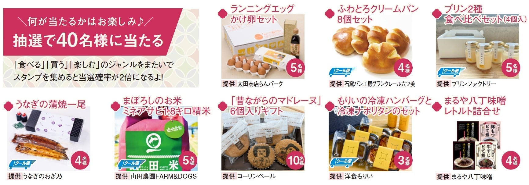 「食べる」「買う」「楽しむ」の3つのジャンルのお店がラインアップされています。3つのジャンルをまたいでスタンプを集めると、なんと当選確率が2倍に!!