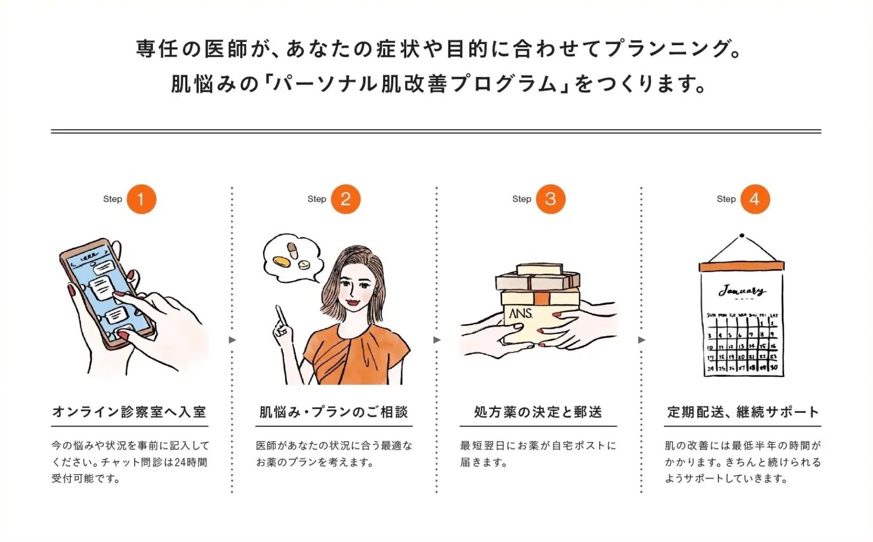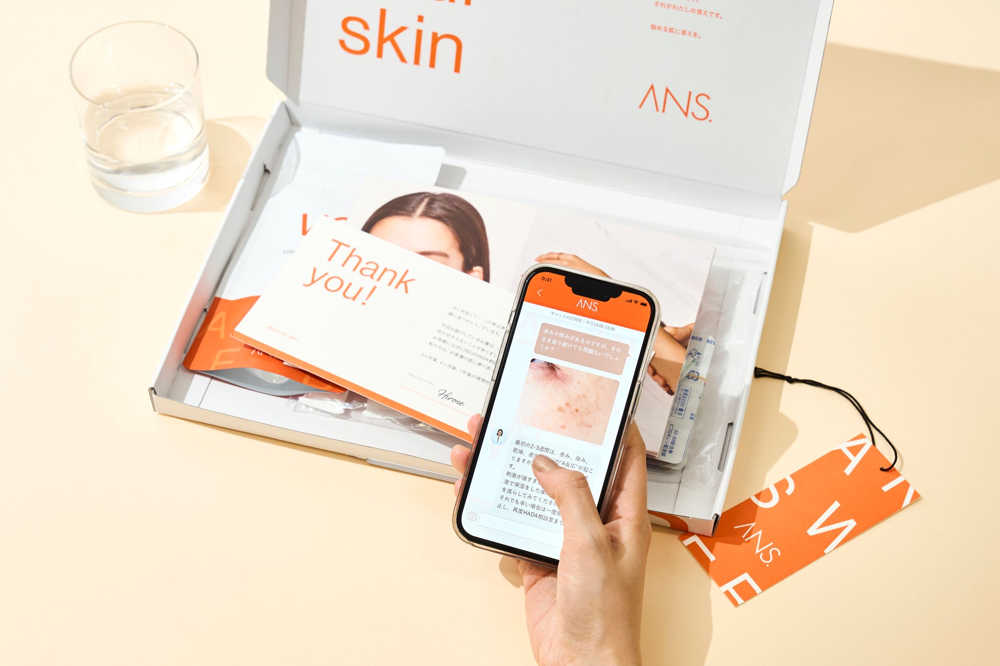 ANS.はスマホで簡単に医師の診察と処方を受け、肌の状態に応じて必要な医薬品やスキンケア用品が自宅に届く「オンライン美肌治療サービス」です。