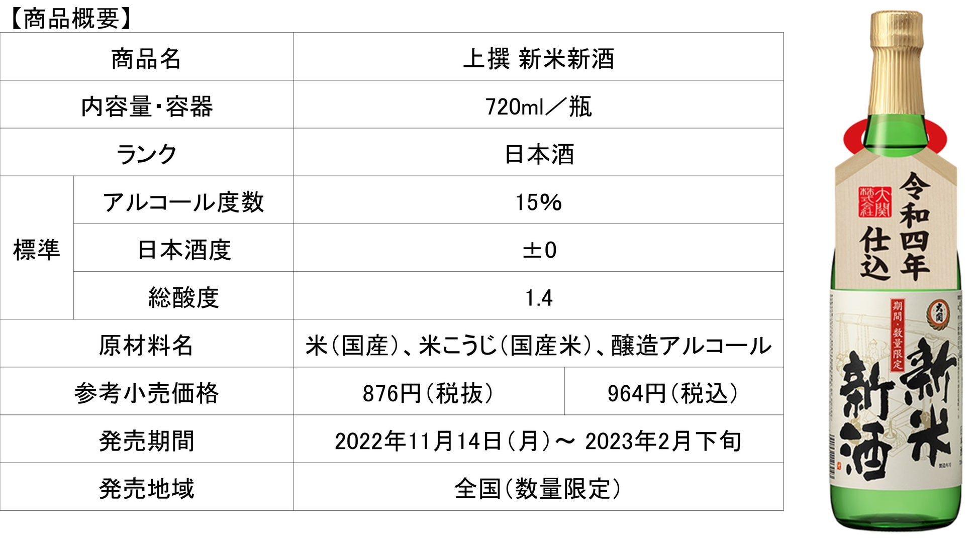 大関株式会社(社長:長部訓子/兵庫県西宮市)は、季節限定・数量限定商品として毎年ご好評いただいております「上撰 新米新酒720ml瓶詰」を2022年11月14日(月)から発売いたします。