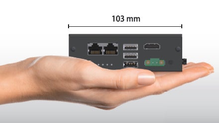 フットプリントはカード2枚より小さく、手のひらサイズの超小型ファンレス専用筐体で限られたスペースでも効率的に設置可能です。また、DINレール金具の取り付けが可能で、別売りのVESAブランケットを用意していますので、ディスプレイ背面へのVESAマウントやウォールマウントも可能です。