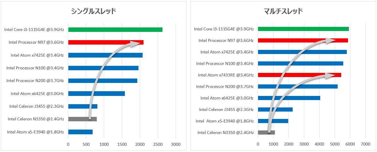 旧モデルのインテル® Celeron® N3350プロセッサーから大幅にパフォーマンスが向上したインテル® プロセッサー N97(Alder Lake-N)とIntel Atom® x7433RE(Amston Lake) プロセッサーを搭載しており、第11世代のインテル® Core™ i3-1115G4E プロセッサーに匹敵する処理能力を実現しています。