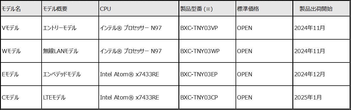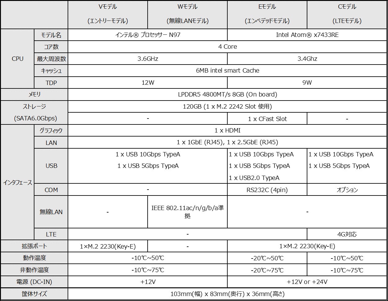 今回発売する「Tiny Edge PC3」シリーズは4モデルあり、手のひらサイズの超小型でありながら、インテル® プロセッサー N97(Alder Lake-N)とIntel Atom® x7433RE(Amston Lake) プロセッサーを搭載しており、第10世代のインテル® Core™ i5-10210U プロセッサーに匹敵する高い処理能力で、AI処理や高度な演算にも対応するパフォーマンスを実現しています。