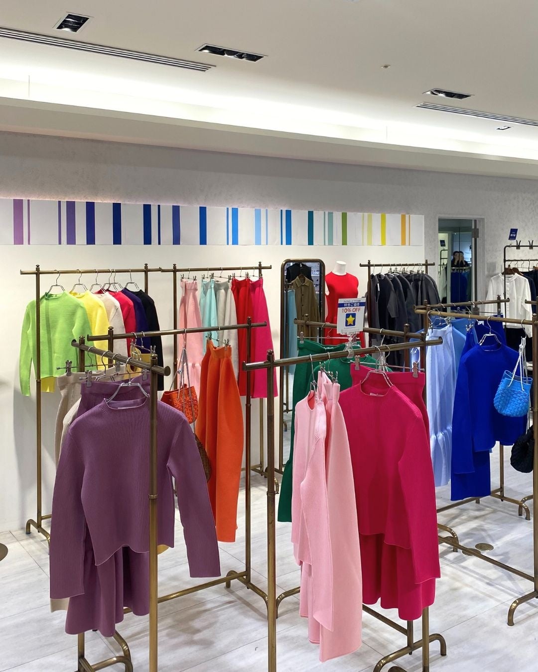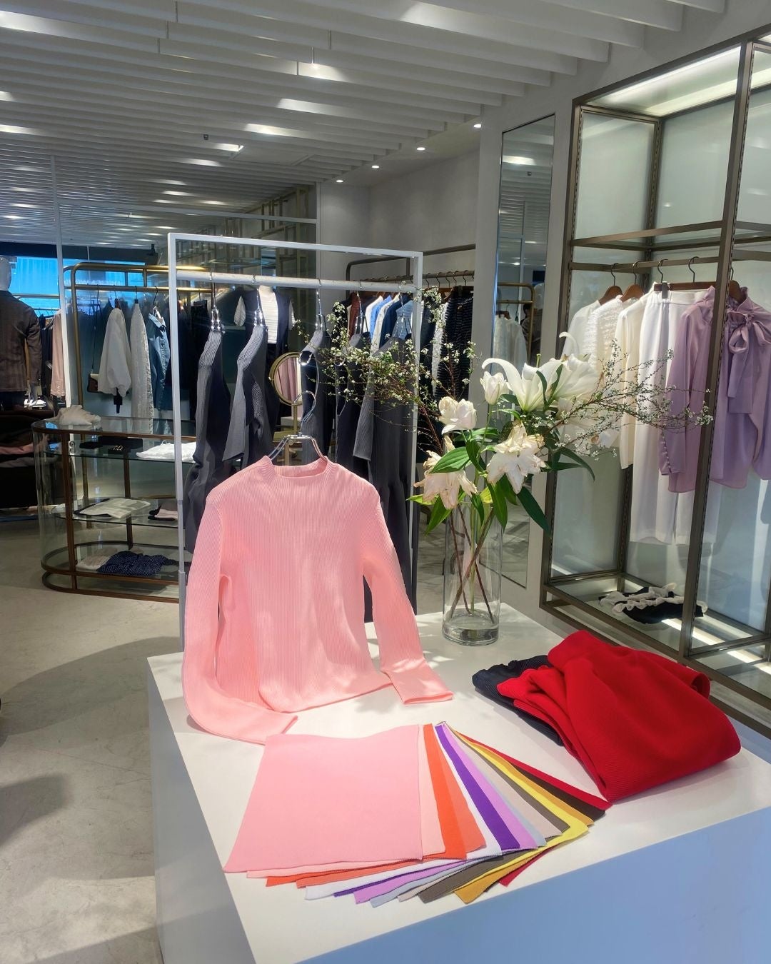 カラー展開の魅力を最大限に打ち出せるような陳列が最適です。カラーサンプルを豊富に用意しているため、広めのスペースでもコンパクトなスペースでも存在感のある店作りが可能。