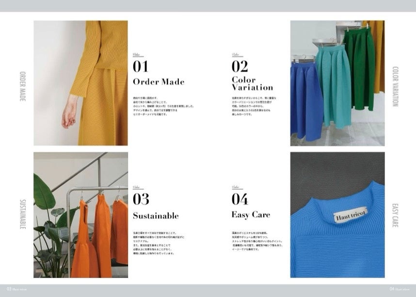 受注生産を中心としており、個人に合わせて丈の調整や豊富なカラー展開など大量生産では手が届かなかったところまで丁寧に対応している。生地の端切れや不要な糸などを出さず、また必要な分だけを編むことで不要な在庫を抱える必要のない体制として環境にも配慮をしている。