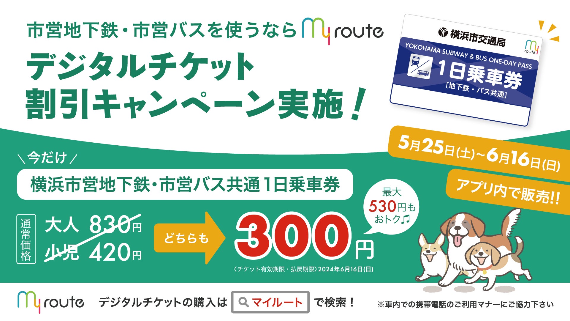 2024年5月25日~6月16日の期間中、横浜市交通局『市営地下鉄・市営バス共通1日乗車券』が通常大人830円・小児420円が300円に!my routeと共に横浜の街の魅力を再発見しませんか?