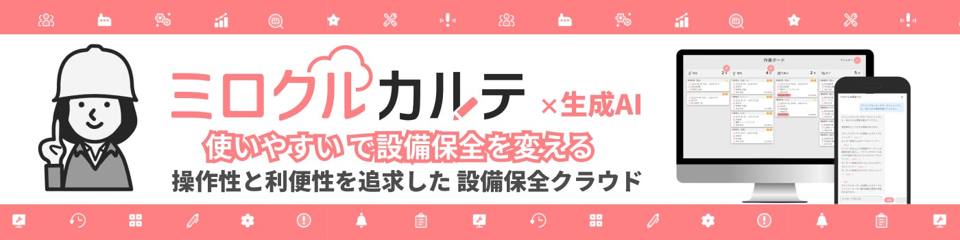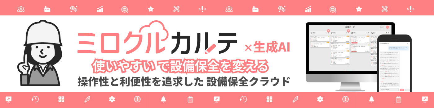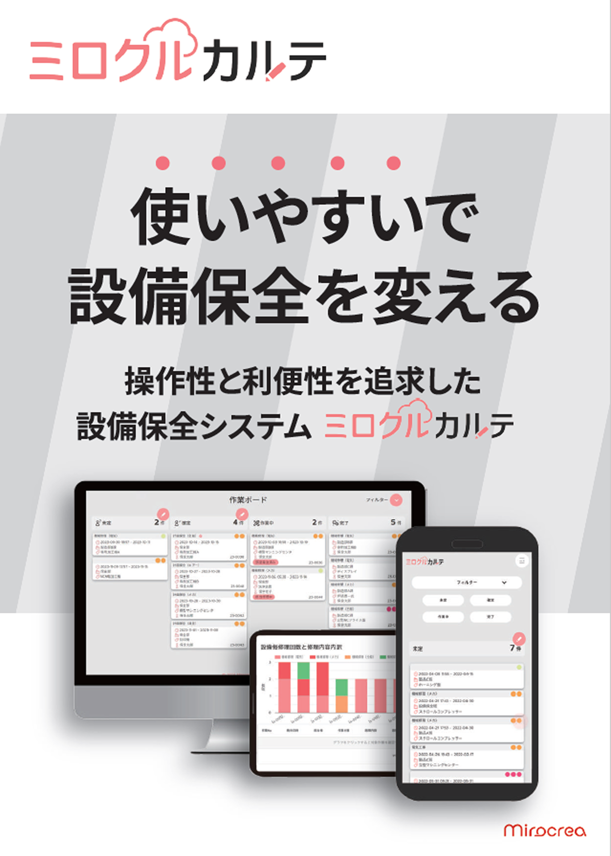 現場での設備保全、「記録が残らない」「ノウハウが属人化する」「判断がベテラン頼みになってしまう」──そんなお悩みに応えるのが、設備保全クラウドサービス「ミロクルカルテ」です。スマホやタブレットで簡単に入力できる直感的な操作性により、日常点検や修理履歴、部品交換などの記録を“ためる・活かす”が自然に定着。履歴が自動で整理され、誰が見てもわかる状態にまとまります。