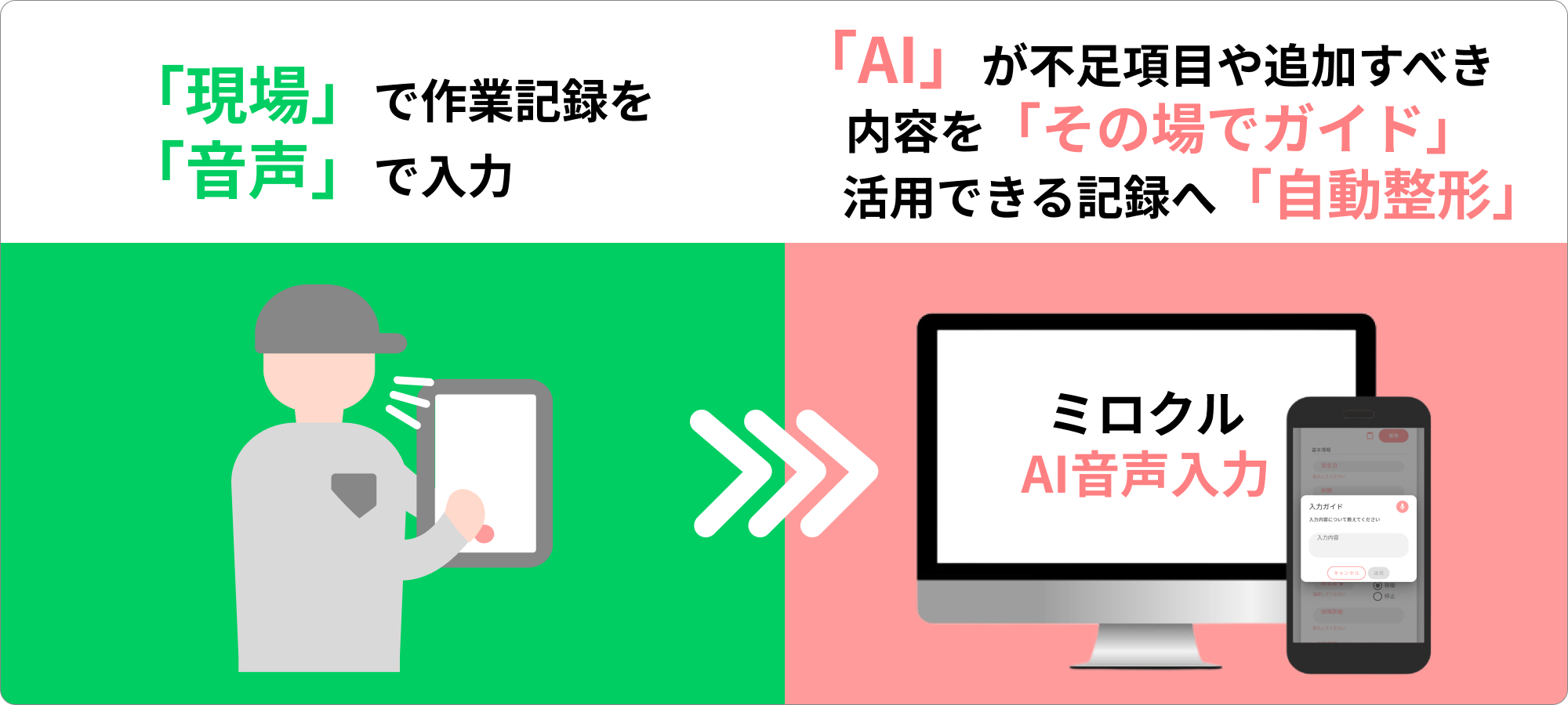 「ミロクルAI音声入力(α版)」は、現場作業中でも音声によって記録を行えるAIオプションです。