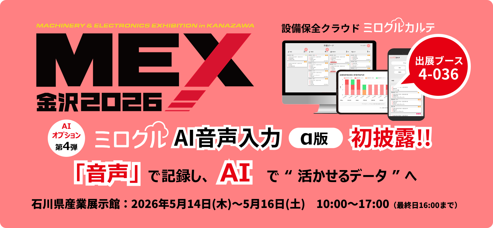 株式会社ミロクリエ(所在地:高知県南国市、代表取締役:井戸隆雄)は、2026年5月14日(木)~16日(土)に石川県産業展示館で開催される「MEX金沢 2026(第62回機械工業見本市金沢)」において、設備保全クラウドサービス「ミロクルカルテ」を出展し、保全現場密着型AIオプションの第4弾となる新オプション「ミロクルAI音声入力(α版)」を初披露します。