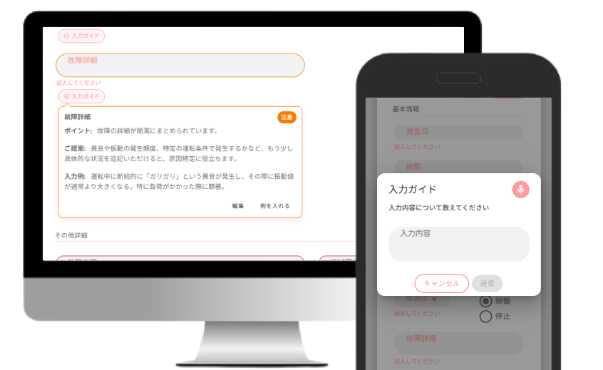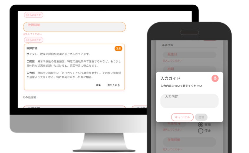 音声入力した内容をもとに、AIが「不足している項目」や「追加すべき情報」をガイドし、入力漏れや表記ゆれをリアルタイムで補完します。