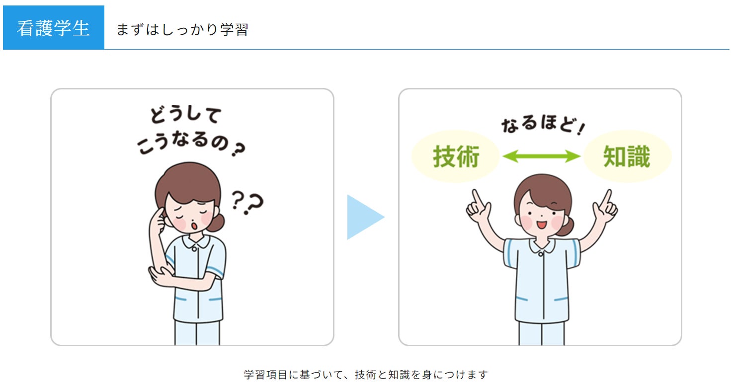 本サービスは看護の専門家チームならではの工夫が満載となっています。技術の進歩とともに目まぐるしく変化する医療と看護に対応できるように、技術映像、講義棟を最新情報に常に更新します。より効果的な学習と実践を考えて、複数の視点から確認が必要な看護技術について360度好きな角度で確認できる映像を随時追加!また、看護手順書と必要物品を集約したビジュアルポケットブックの提供等、臨床の現場で役立つコンテンツを提供していきます。