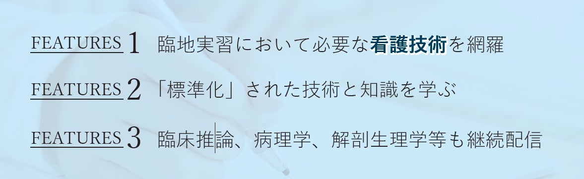 本サービスは看護学生の臨地実習や授業に役立つように、下記のような3つの特長をもって看護を学ぶ学生にわかりやすく完全設計されています。