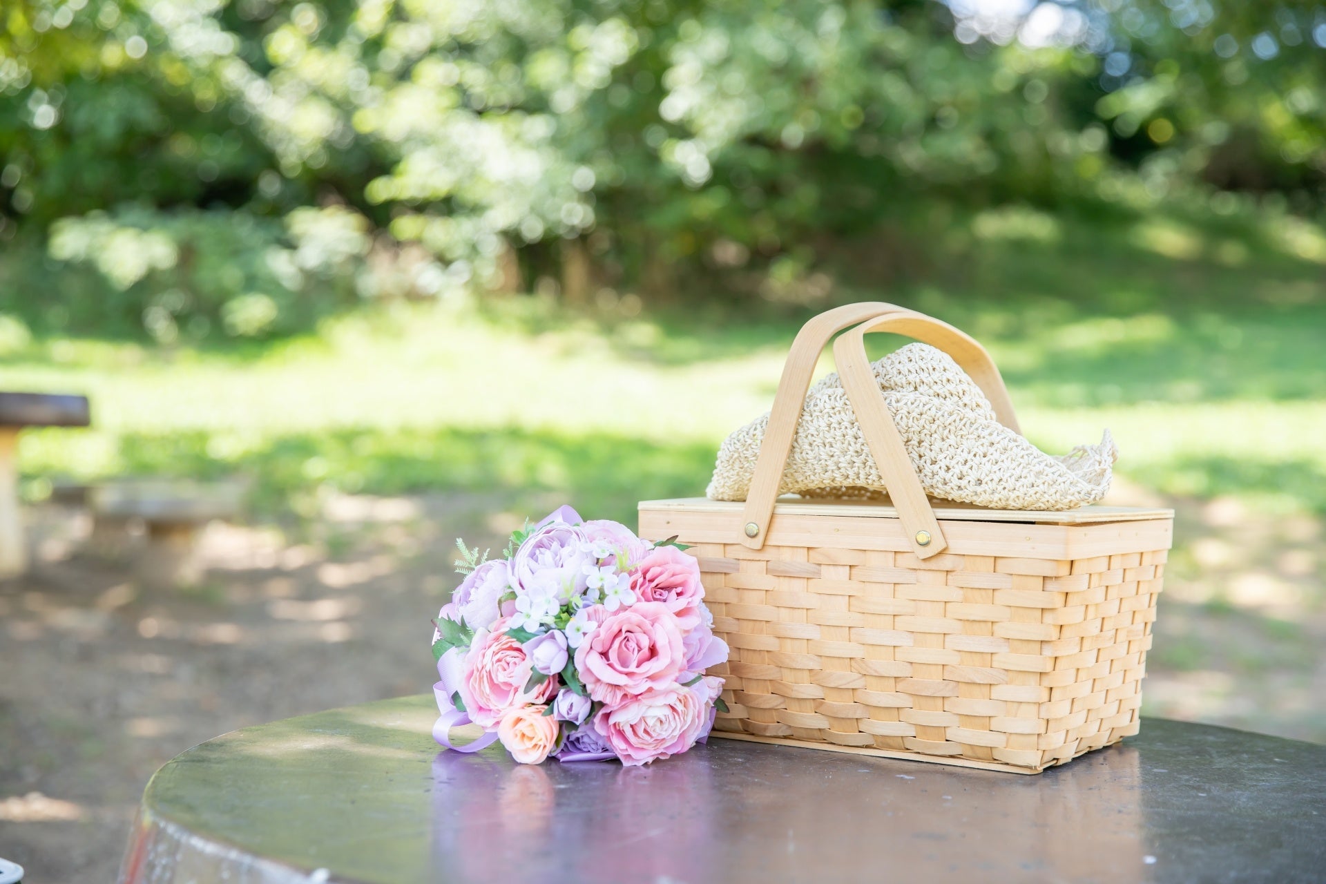 ①雄大な山の麓で、新鮮な空気に包まれながら朝食を味わえるウッドデッキとピクニックバスケットを展開