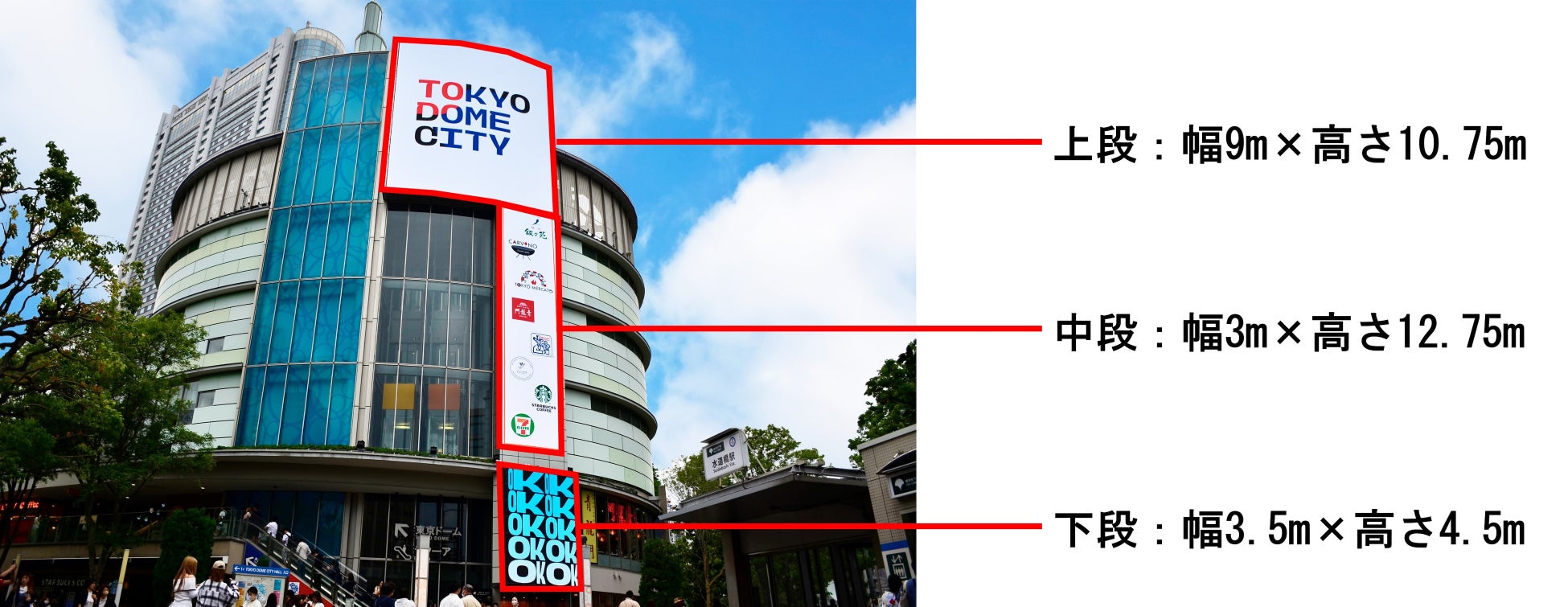 「ミーツポートビジョン」は、上段(幅9m×高さ10.75m)、中段(幅3m×高さ12.75m)、下段(幅3.5m×高さ4.5m)の3面で構成された大型ビジョンです。東京ドームシティの南東エリアに位置する複合施設「MEETS PORT(ミーツポート)」の地上1~5階の外壁に設置されています。