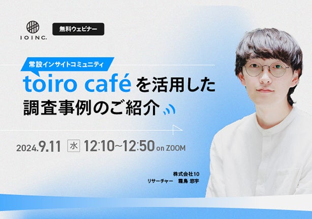 共体験から価値を共創する株式会社10(本社:中野区、代表取締役 佐藤 尊紀、以下10INC.)は、9月11日(水)12:10から、無料ウェビナー「常設インサイトコミュニティtoiro caféを活用した調査事例のご紹介」を開催します。