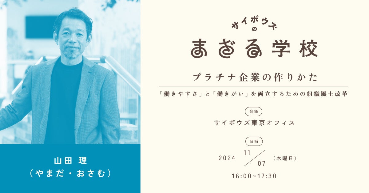 2024年11月7日(木)に開催する講義「プラチナ企業の作りかた 働きやすさと働きがいを両立するための組織風土改革」では、『最軽量のマネジメント』の著者で元サイボウズ副社長の山田理氏(現KTゲームチェンジャーズ株式会社代表)をお招きし、離職率28%の時代を乗り越え「プラチナ企業」となったサイボウズが行ってきた数々の働き方改革の手法や社員エンゲージメントの向上、さらにコロナ禍以降の組織風土改革などを講義いただきます。