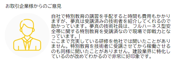 自社で特別教育の講習を手配すると時間も費用もかかりますが、夢真は受講済みの技術者を紹介してくれるので助かっています。夢真の技術社員は、フルハーネス型安全帯に関する特別教育を受講済なので現場で即戦力となっています。