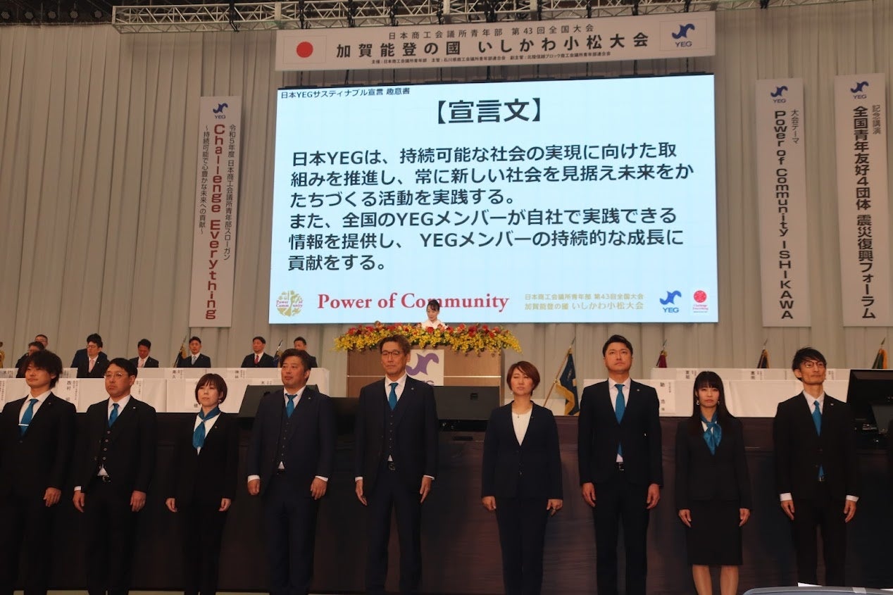 その集大成として、3月13~17日に開催した第43回全国大会 加賀能登の國いしかわ小松大会の記念式典内(3月16日)で「日本YEG サスティナブル宣言」を発表した。