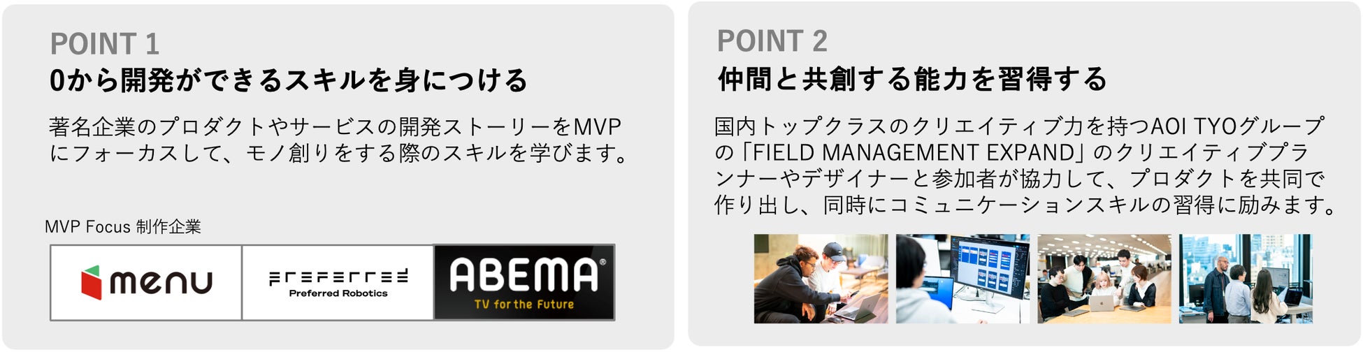 本プロジェクトは ① 0から開発ができるスキルを身につける ②仲間と共創する能力を習得する の2つのポイントを軸に、エンジニアの創造性を刺激し、モノ創りの喜びを再発見するために様々なコンテンツを展開します。①著名企業のサービス開発ストーリーにおいて重要な役割を果たしたエンジニアに焦点を当てたドキュメンタ リーフィルム『MVP Focus ※ 』のムービーを制作し、公開致します。
