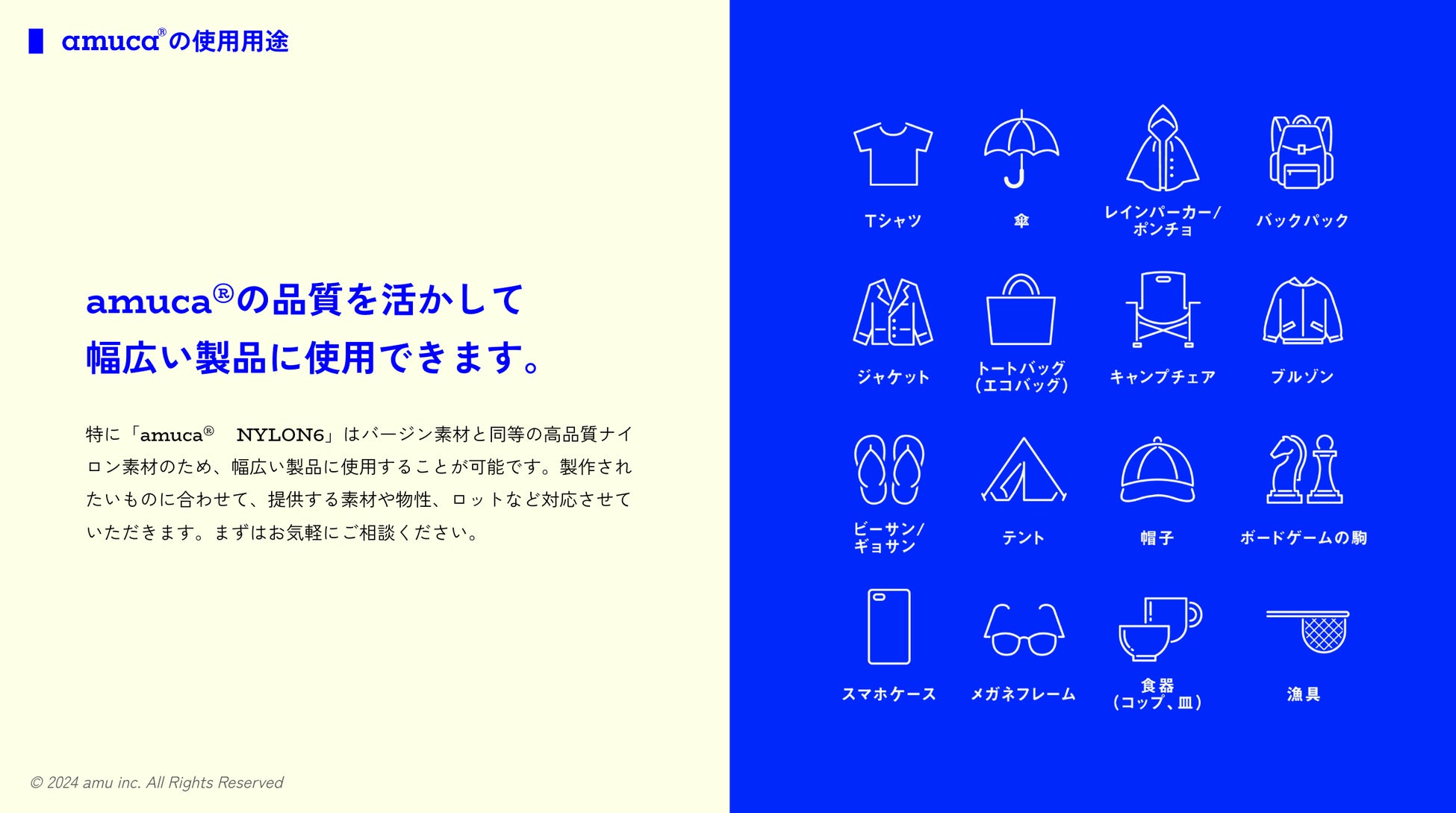 今後はアパレル、家具、建材などさまざまな業界のメーカーと協業し、amucaを用いた製品を開発していくことで、漁具から価値の常識をひっくり返していきます。