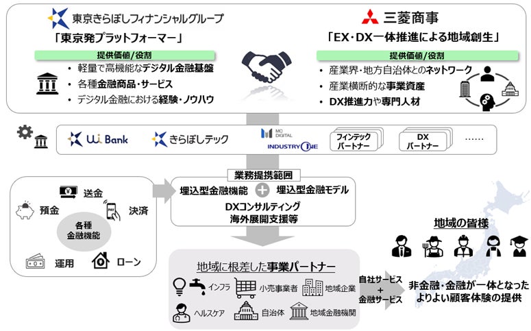 きらぼしFGと三菱商事は、自社サービスの魅力向上を目指す事業パートナーと協業し、きらぼしFGが有するデジタル金融事業における知見・サービスと、三菱商事が有する実業知見・ネットワークを組み合わせることで、既存サービスに金融機能を埋め込むだけでなく、生活者に非金融・金融が一体となったより良い顧客体験をご提供することを目的とし、埋込型金融分野を中心とした共同事業化を目指した本業務提携に至りました。