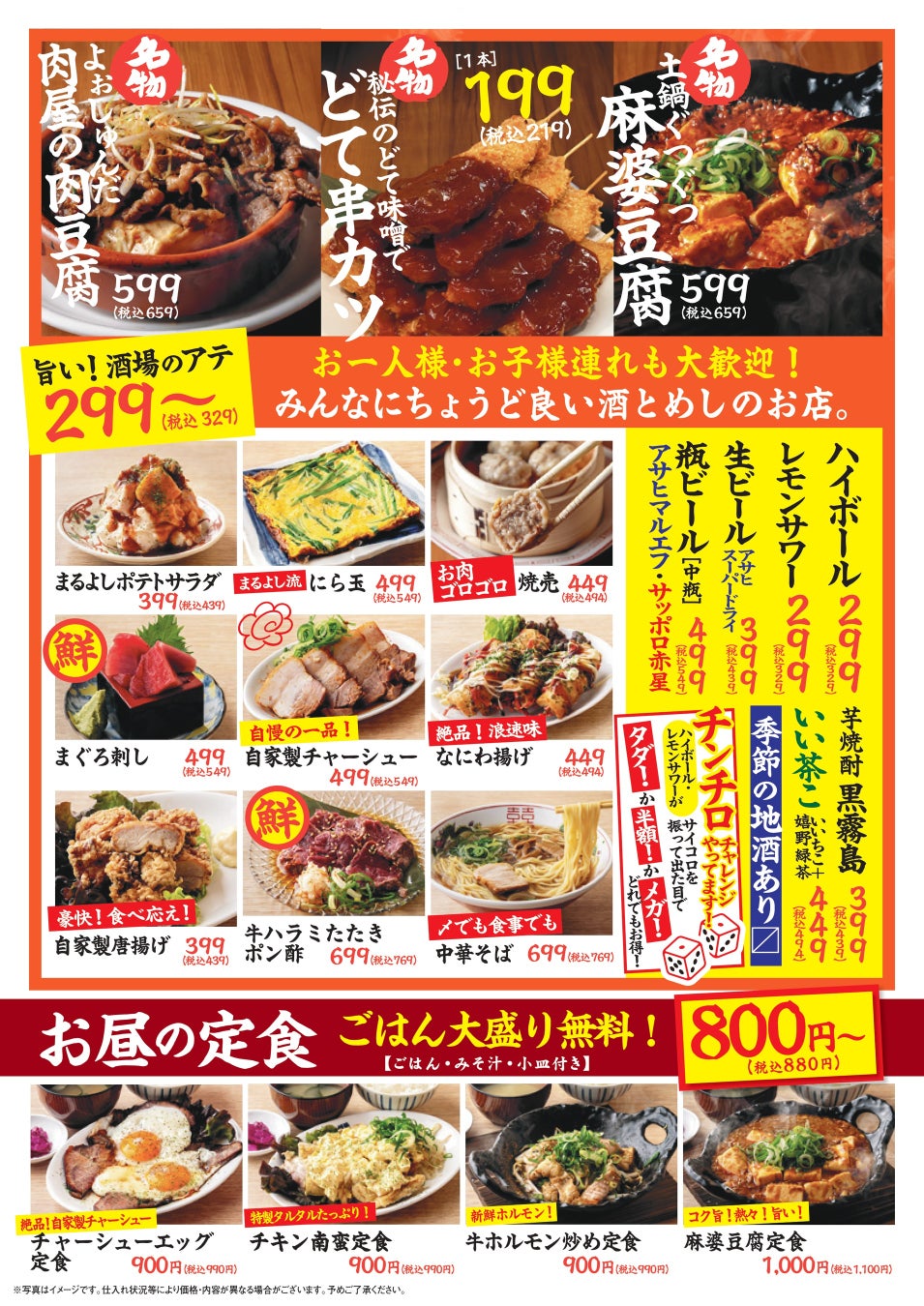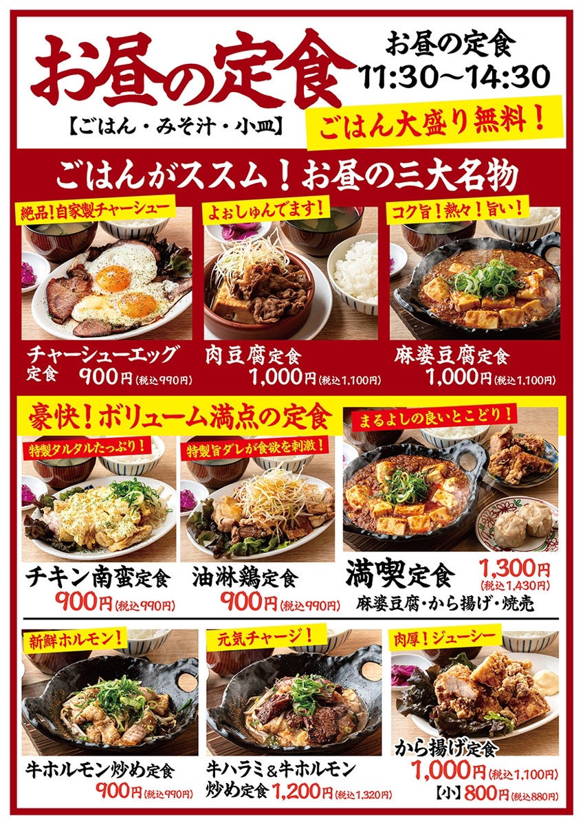 まるよしのランチメニューはボリューム満点!新鮮な肉屋のホルモンやこだわりの中華が、ごはん、味噌汁、お漬物付きで税込990円~で楽しめます。