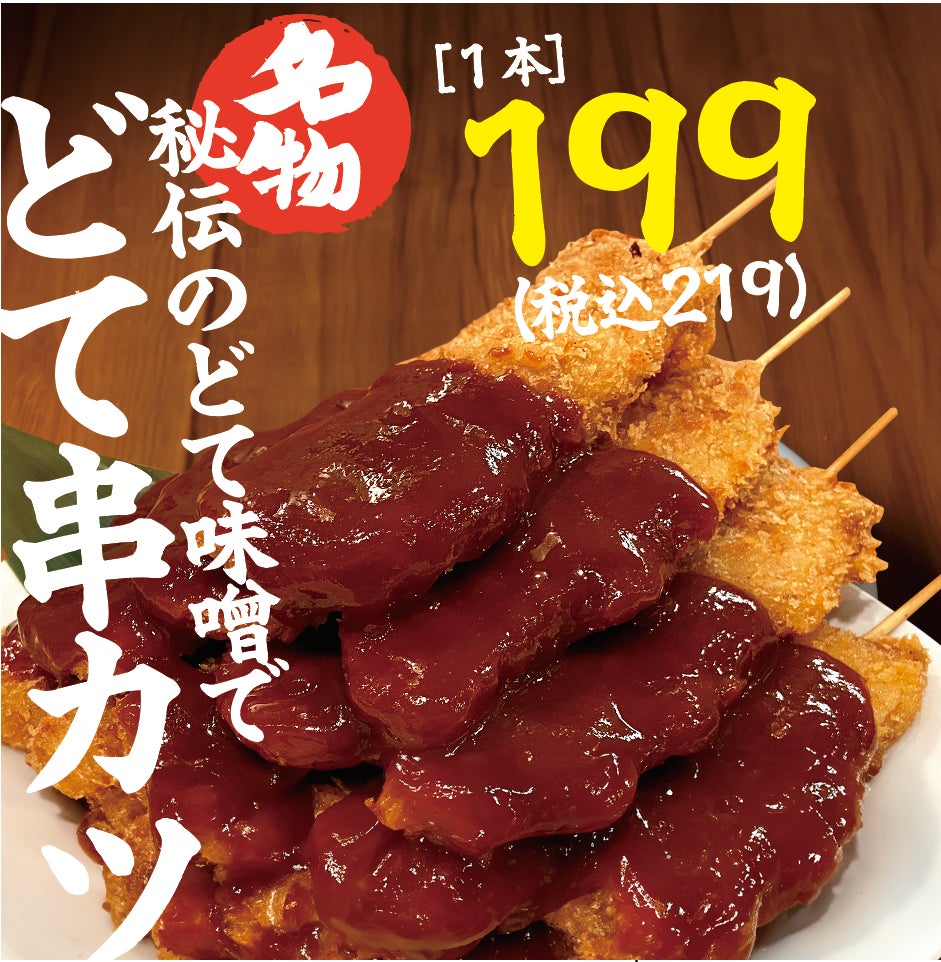 サクサク衣の串カツに、秘伝の濃厚どて味噌をたっぷり絡めた至極の一本!この旨さでこの価格はコスパ最強!何本でも食べたくなる自慢の串カツです!