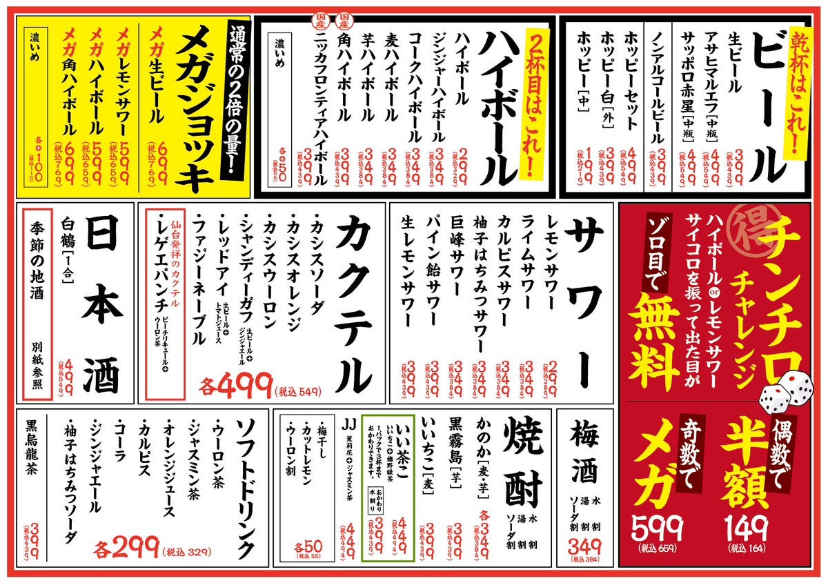料理は299円〜、生ビールは399円、ハイボール&サワーは299円〜と、たっぷり食べて、たくさん飲める安心価格でご提供しております。