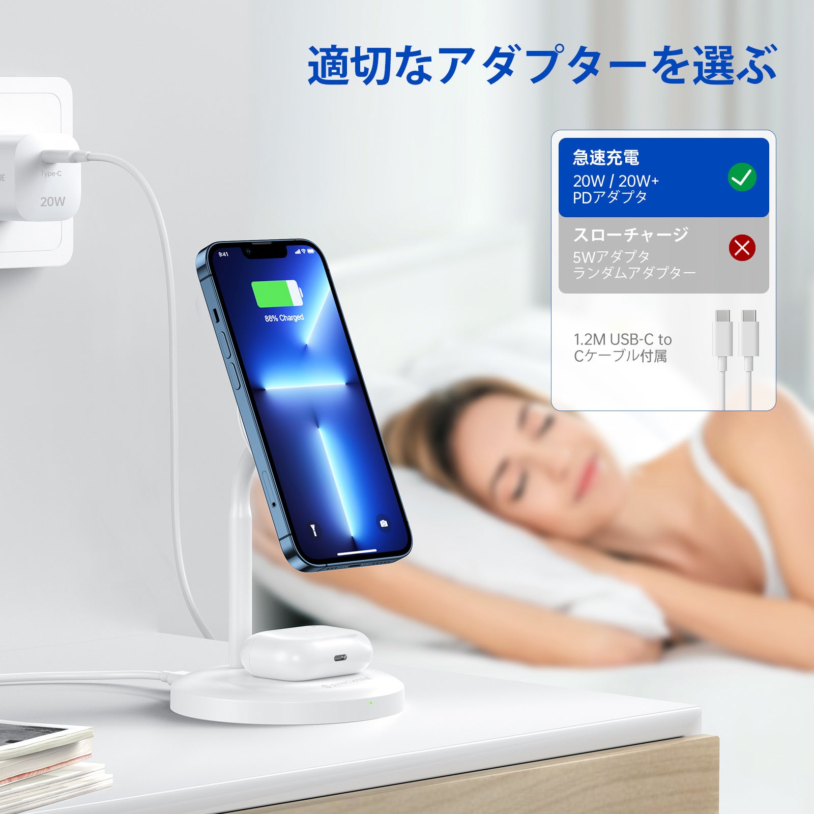 【2台同時充電& Mag safe対応充電器】iPhoneやAirPodsを置くだけで充電できるので、充電ケーブルの抜き差しを繰り返さなくて済みます。Syncwireワイヤレス充電スタンドの上部は最大出力15Wを供給でき、MagSafe 7.5Wの充電ニーズを完全に満たし、iPhone 12 Proをわずか2時間半でフル充電することが可能です。iPhone 12及び13シリーズのMagSafe機能に完全にマッチし、Airpods 2、Airpods 3、Airpods プロにも対応します。